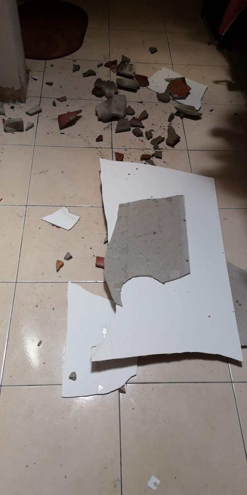 Mimi sampai rumah pukul 6 petang. Bila buka pintu Mimi tengok bilik Mimi terang tau . Jadi pelik pula macam mana boleh terang sedangkan suis lampu dah tutup . Bila masuk bilik ,Mimi terkejut sebab atap dan siling bilik utama pecah. Lantai penuh bertaburan dengan atap genting yang pecah dan air. Mimi assume pecah sebab hujan lebat dan angin kuat. Langsung tak terfikir pasal pecah rumah. Terus snap gambar send whatsapp dekat suami.