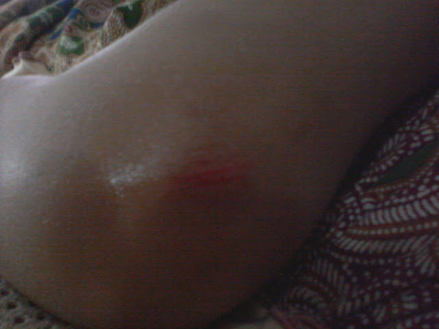 Sekali incik hubby bagitahu kaki Auni kat lutut luka....PU apa lagi membebel bebel lah kat incik hubby. Dia sibuk sangat bawak anak anak main kat luar. Dia leka berborak dengan jiran jiran, sampai kaki anak terluka..