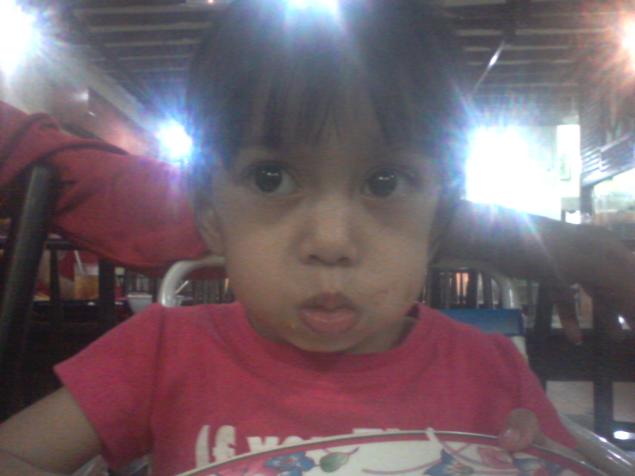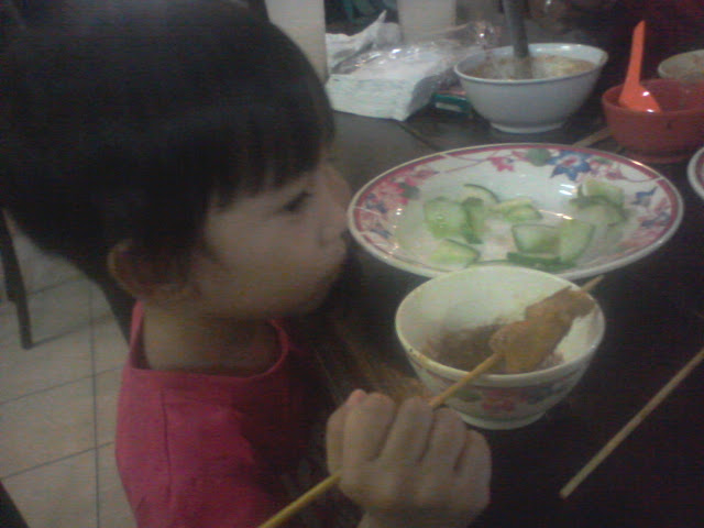 Gaya mulut nih bukan Auni sengaja buat buat ye tapi gambar nih saya snap masa dia tengah makan sate...Habis sume sate yang abi die asing aisngkan dalam pinggan dia sumbat dalam mulut dia sampai penuh...Saya dengan incik hubby terus ketawa tengok gelagat Auni masa nih....Alahai sabar jelah...Punyalah perlahan dia nak kunyah sate tuh....