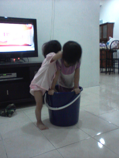 Memang tak boleh blah tengok dua beradik nih berusaha sedaya upaya nak muatkan badan memasing dalam baldi yang tak besar mana. Memang kepantangan bagi dua beradik nih nampak ada baldi kosong, confirm akan jadi mangsa diorang...Sabar jelah melayan karenah anak anak.....