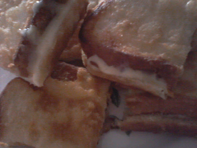 Cheese siap meleleh keluar lagi.....Cara nak buat pun senang aje...Roti (beberapa keping ikut pada kemampuan korang nak habiskan) + tepung (lebih kurang 4 sudu untuk 4 keping roti) + air + garam + cheese...Mula mula bancuh tepung dengan air + garam...Bancuhan tuh jangan pekat atau cair sangat. Ala ala macam nak buat jemput jemput tuh...Lepas tuh letakkan cheese kat atas roti dan lipat dua...Kemudian ambik roti yang berlipat dua tuh korang golek golekkan dalam bancuhan tepung...Panaskan minyak..Bila dah agak panas korang masukkan roti dan goreng macam biasa....Tak lama pun nak goreng...Sedap tau bila makan time panas..Rangup je bila makan roti goreng tuh + cheese yang cair meleleh leleh....