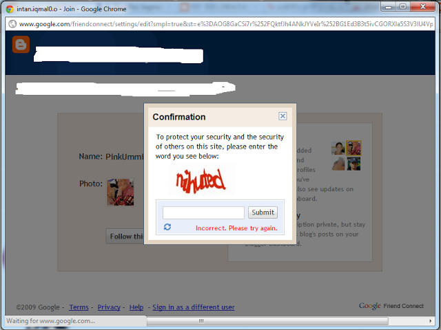 Banyak kali saya masukkan password tuh. Sebelum klik submit akan makesure betul betul ejaan yang saya taip sama dengan perkataan yang diberi. Bila submit, incorrect pulak. Bukan sekali dua tapi banyak kali buat tak boleh jugak....So, apa lagi kan terus out jelah dari blog tuh. Elok elok nak follow terus tak jadi follow...Kenapa erk mesti keluar macam tuh. Mesti kawan kawan yang sewaktunya dengannya ada do something kat setting...Ce rajin rajinkan diri tukar balik setting korang...Tak best kalau korang follow blog saya tapi saya tak follow blog korang....Bukan saya sombong tapi disebabkan masalah masalah kat atas nih la buat saya tak boleh nak follow....