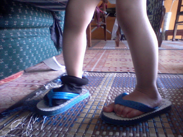 Bila dah pakai stokin tuh, dia terus sarung selipar...Yang buat gelihati tuh dia sarung sebelah kaki aje, lagi sebelah tak berstokin....Lepas tuh, mula lah dia buat catwalk....Aduh lah anak dara saya seorang nih memang macam macam fiil dia tau....Ada saja yang dia nak buat...