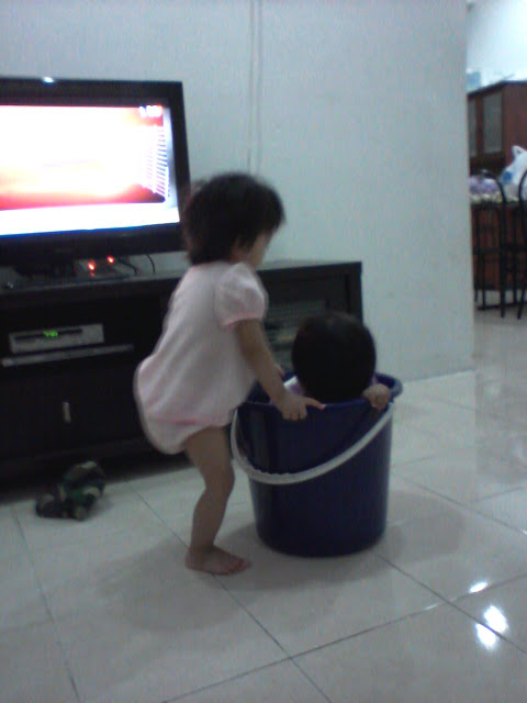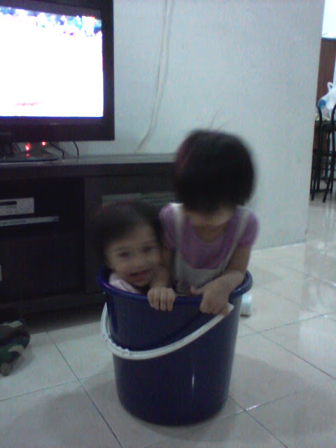 Alkisah dua beradik yang mempunyai hobi yang sama iaitu suka main sumbat sumbat dalam baldi. Bukan sumbat barang, baju atau mainan diorang ye tetapi menyumbatkan diri memasing dalam baldi.....Jom belajar cara nak menyumbatkan diri sampai muat....Harap maaf kualiti gambar yang agak kabur dan sila besarkan diameter mata kawan kawan yer...