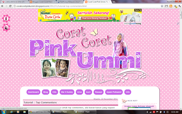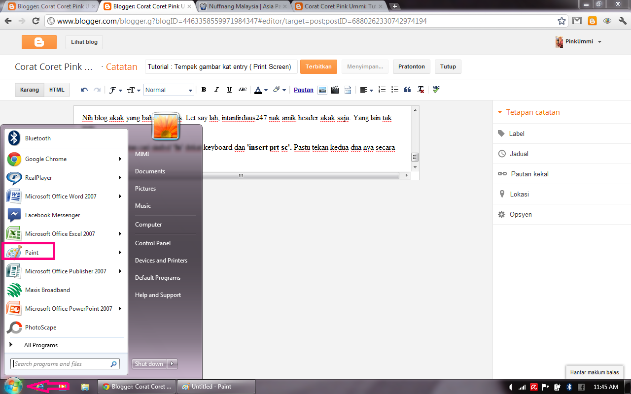 Semalam ada request daripada salah seorang blogger intanfirdaus247 tanya saya macam mana tempek gambar dalam entry tutorial saya semalam. Untuk pengetahuan intanfirdaus247, gambar dalam entry tuh akak guna kaedah print screen dan tempek dalam entry. Akak ajar awak step by step ye....Sebagai contoh akak ajar cara nak ambik header dekat blog akak.