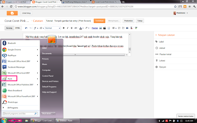 2. Lepas tuh, klik 'Start' (anak panah pink) dan akan keluar kotak di sebelah kiri. Klik 'Paint' macam gambar kat bawah nih. (yang akak highlightkan dgn kotak pink)