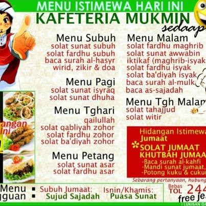 BalasPadamslalu menu ayam grgkfc,ciken chop,ikan bakar,satay bagai..kali ni mmg menu sampai ke akhirat..insha Allah..kita praktikkan bersama :)