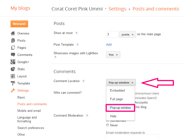 4. Pastu kat Comment location tuh (anak panah), korang klik kat button bentuk segitiga tuh lepas tuh pilih pop-up window...