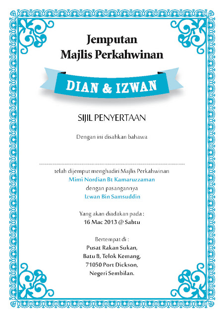 Disebabkan saya diberi mandat untuk settle kan kad kahwin adik saya, maka saya bertungkus lumus lah untuk cari designer kad kahwin. Payah juga kan tapi nasib baik saya berkolaborasi dengan busu saya tentang design kad kahwin nih....Saya ber gambaran dan contoh, busu saya design ikut seperti yang saya beritahu. Deal thru fb messenger je....So, nih la hasil perbincangan kitorang dan telahpun dipersetujui oleh bakal pengantin. Fuh, lega...Settle satu part....