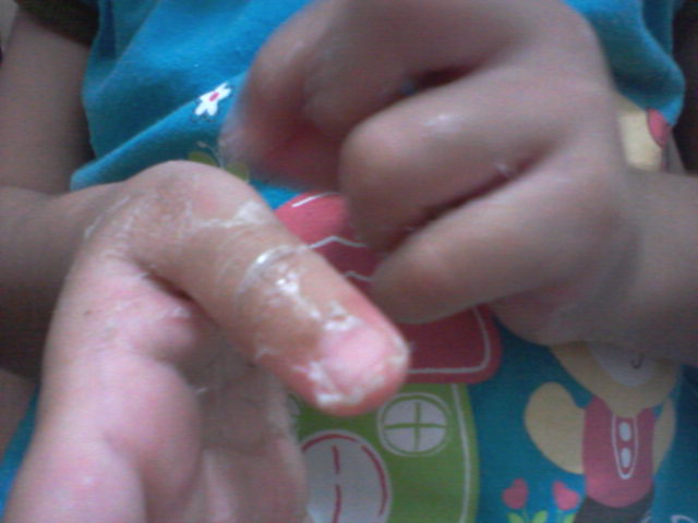 Sekali dia tunjuk kedua dua tangan dia. Terkejut beruk saya time tuh. Tangan Auni megelupas. Bila masa pulak kulit tangan dia mengelupaskan. Petang tadi elok aje. Bila saya tenung semula, alahai....Sabar ajelah dengan fiil anak dara saya nih.....Rupa rupanya bukan kulit dia tapi.....