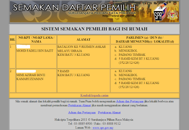 Baru baru nih saya ada check tempat saya kena mengundi. Sebab sebelum nih saya tak pernah ambik tahu pun. Suami saya cakap kalau saya tak pernah mendaftar, secara otomatik nama saya telah didaftarkan bila saya berkahwin dengan tentera. Saya fikir incik hubby main main. Sekali bila check memang betul nama saya ada...Tapi agak pelik kenapa jauh bebenar tempat nak mengundi tuh? Musykil...