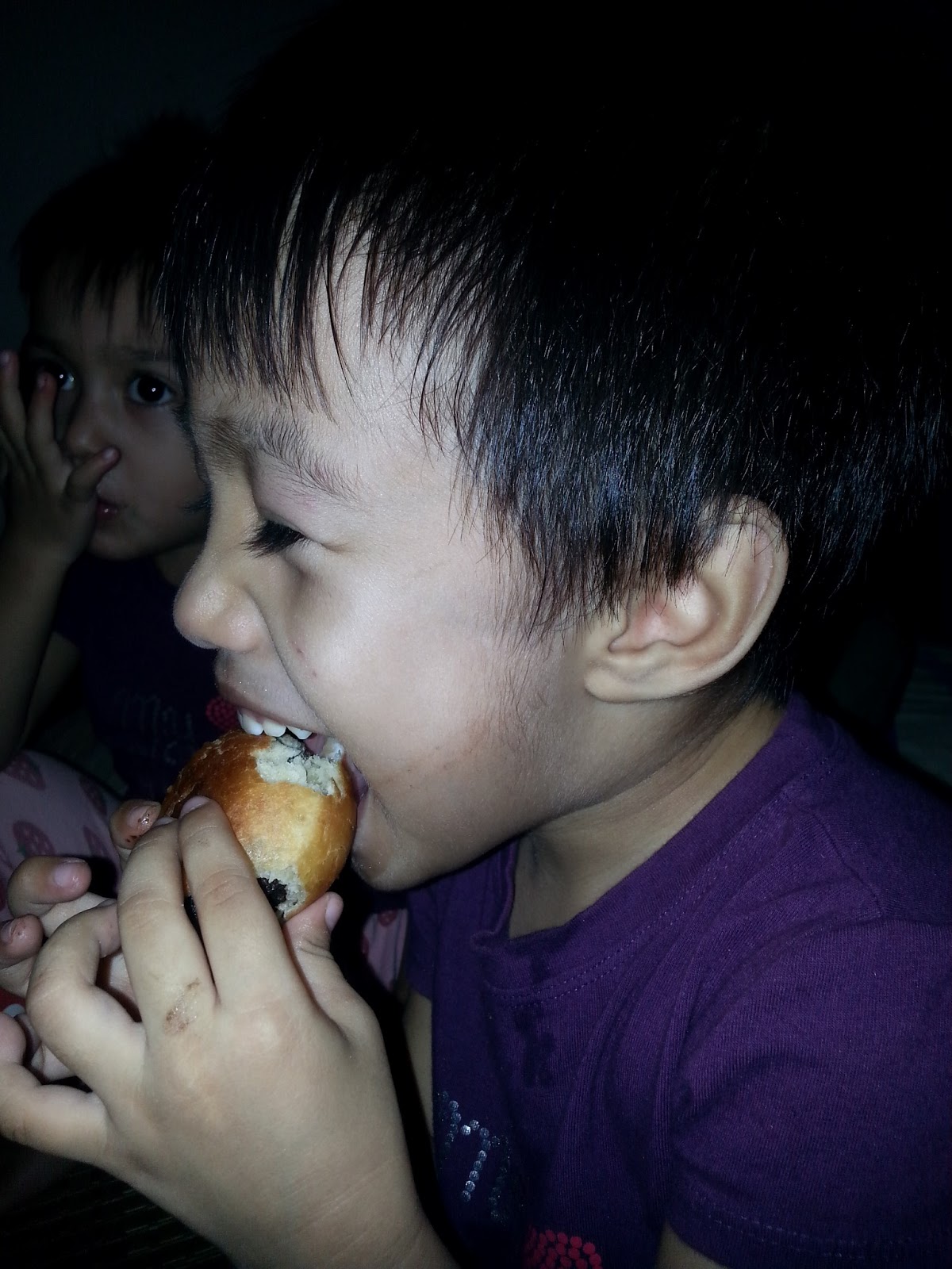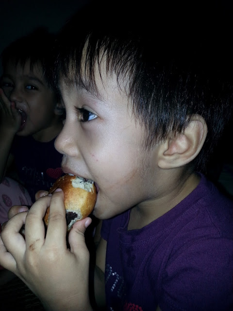 Tengok muka Aina yang beria-ia makan pau goreng....Sampai pejam pejam mata makan pau goreng...