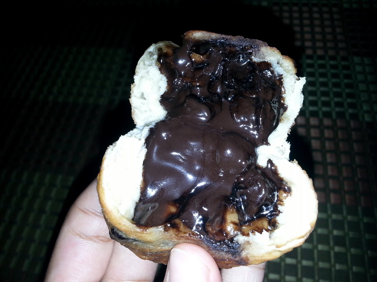 Tengoklah lelehan coklat dari pau goreng yang panas nih...Coklat nih saya beli kat kedai jual barangan buat kek dan biskut....Coklat nih rasa dia sama macam coklat Nutella...