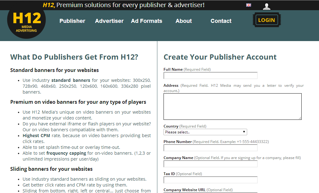 Premium on video banners for your any type of players Use H12 Media's unique on video banners on your websites and monetize your video content. Do you have external iframe or flash players on your website? Our on video banners compatiable with them. Highest CPM rate, because on video banners providing best click rates. Able to set splash time-out or overlay time-out. Able to set frequency capping for on-video banners. (1,2,3 or unlimited impressions per user/day)