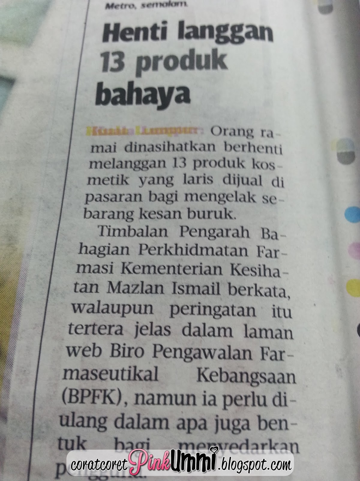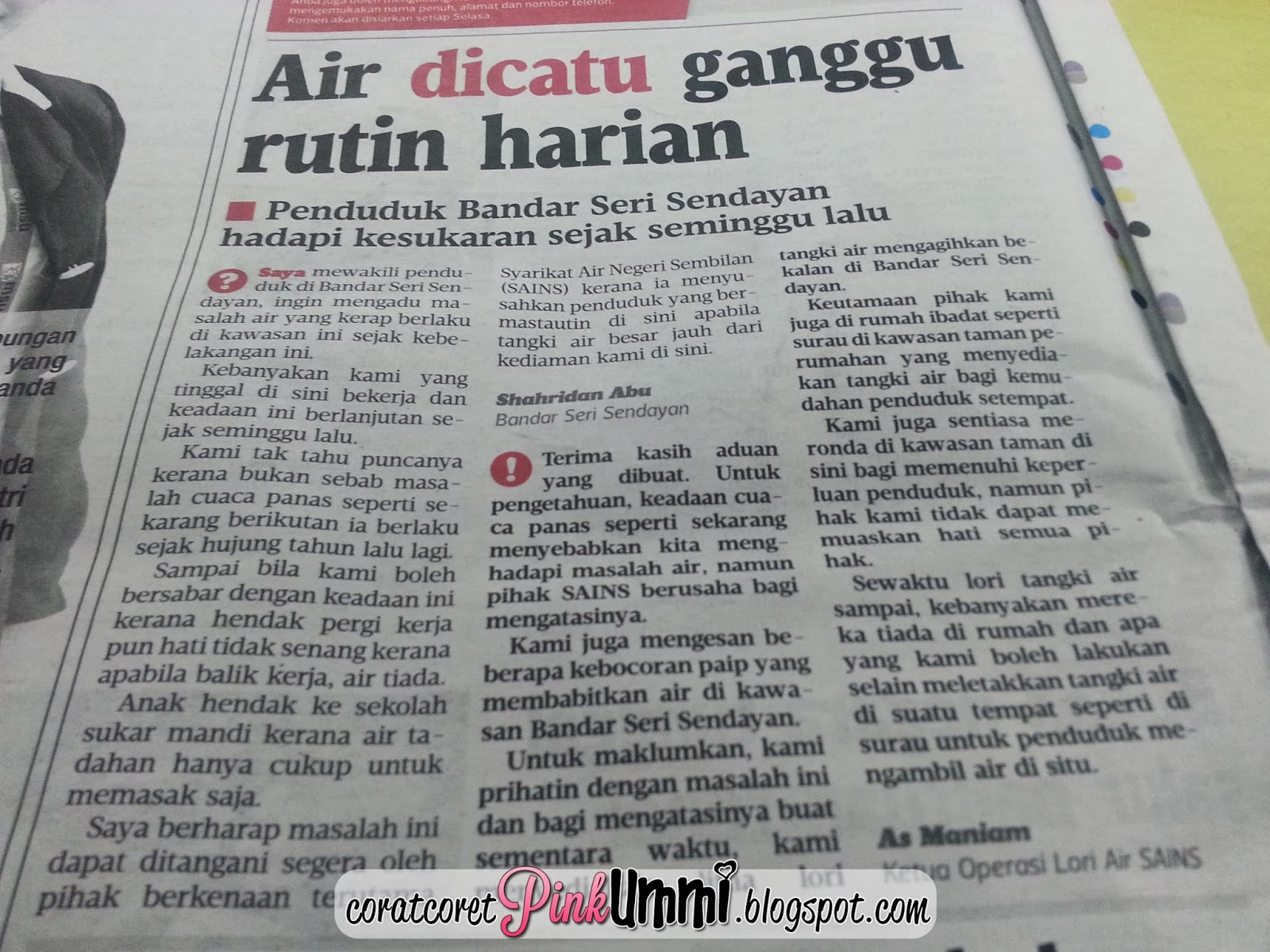 Keratan akhbar Harian Metro yang saya snap dan terus wassup kat incik hubby...Hahaha tak sangka ada jiran yang mengadu hal nih (walaupun saya tak pasti jiran nih area mana sebab banyak taman kat sini tau)...Memang tahap kronik masalah air yang melanda kawasan perumahan saya sekarang nih...Sampaikan Sabtu lepas terpkasalah saya anak beranak angkut baju balik Telok Kemang sebab air tangki langsung takde...Bayangkanlah nak masak macam mana???Anak anak nak buang air pun tak boleh...Nasib baik saya dan anak anak sempat mandi pagi Sabtu tuh...Tengahari langsung takde air dah...Parah memang parah...