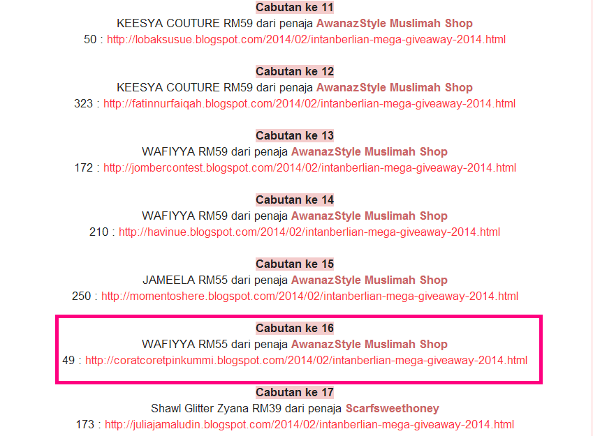 Nak diingatkan sekali lagi, sesiapa yang tak tinggalkan link blog dikira sebagai DISQUALIFIED...Sebab korang tak menepati syarat syarat yang saya tetapkan...Kalau nama korang ada maknanya link blog disertakan...