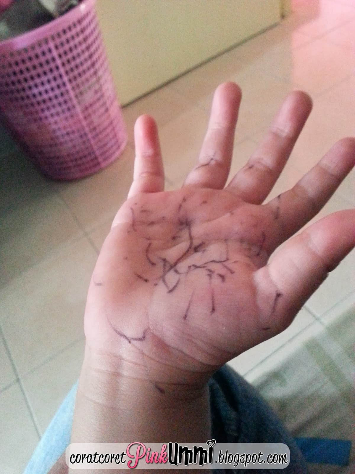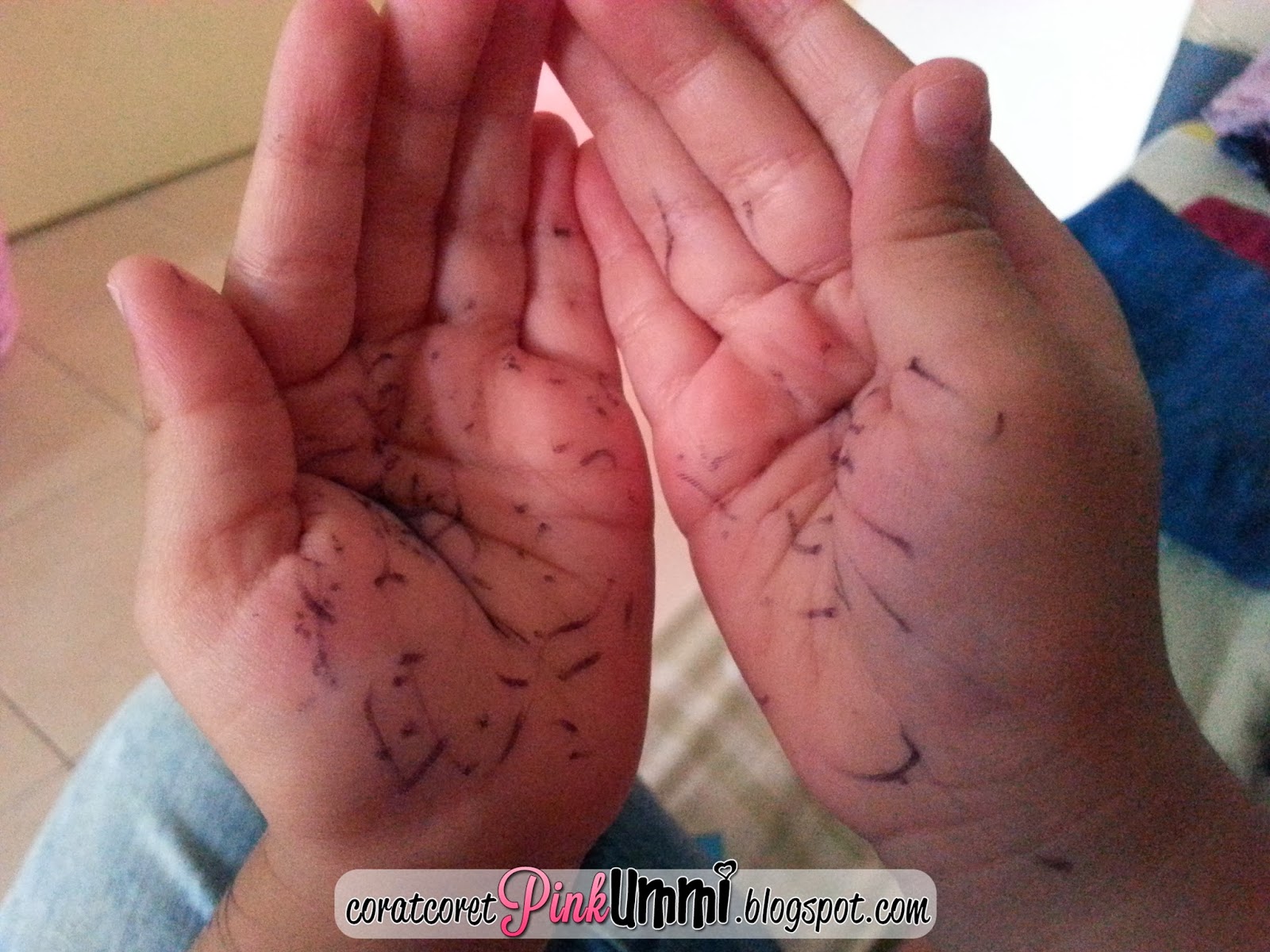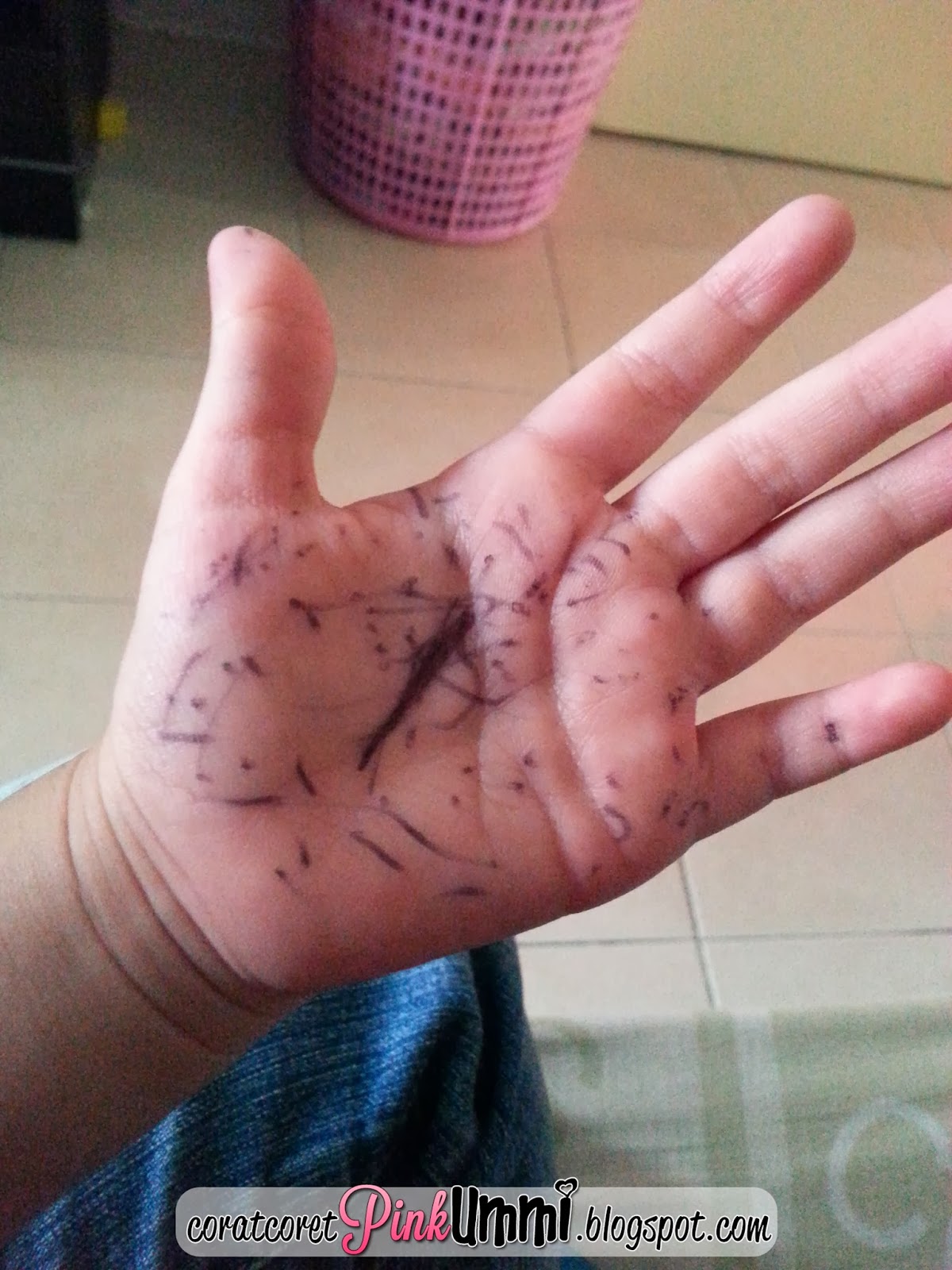 Tengoklah perangai anak dara saya Auni...Tak cukup conteng kat kertas dengan dinding tapak tangan dia pulak jadi mangsa...Adoiii la anak....Saya plan nak belikan diorang white board besar gantung dekat dinding...Contenglah sepuas hati kan....