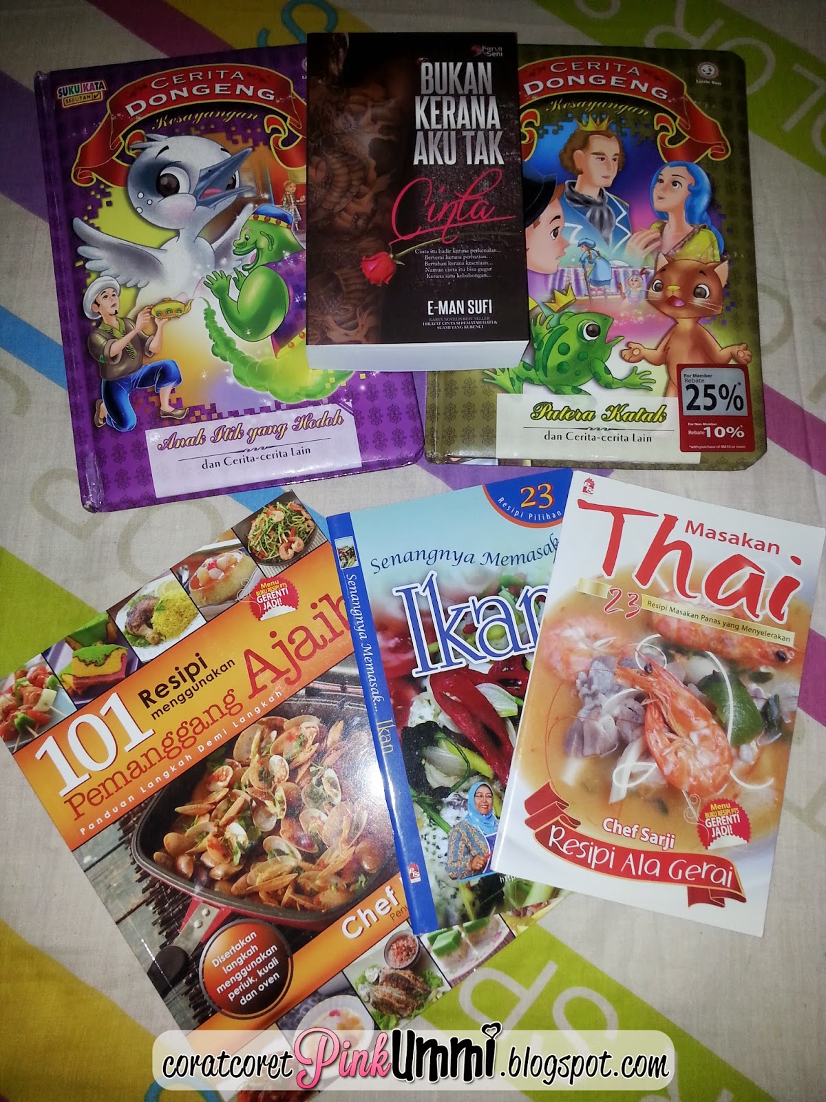 Hasil rembatan dekat Popular Sabtu lepas....Ada satu buku takde dalam gamabr...Doa amalan pergi Haji..Beli untuk ayah mentua....Dua buah buku cerita dongeng tuh untuk Aina dan Auni....Diorang pilih sendiri...Masuk masuk aje Popular terus diorang meroyan tengok buku...hahaha...Perangai macam Ummi dia dah..Nampak buku meroyan terus...