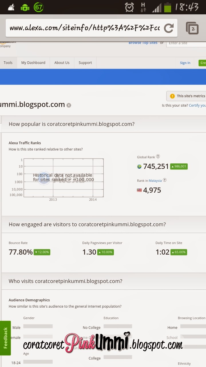 Lepas tuh, sajok sajok lah nak check ranking alexa blog pink picisan saya nih. Dan nih lah keputusan ranking alexa...Nampak sangat puan blog lemau lagi...Malas nak update blog...hahaaa...harus usaha lebih..