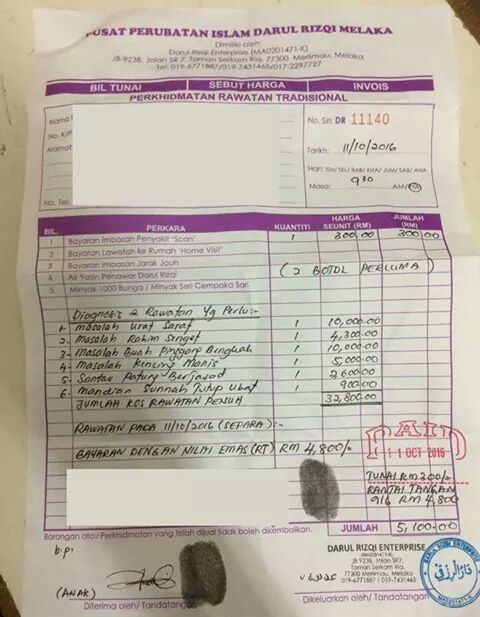 Bila tengok resit seperti gambar di atas, sungguh Mimi tergamam. Tak tahu nak cakap apa. Sanggup mempergunakan agama untuk raih pendapatan. Tidak terfikirkah pemilik pusat perubatan tersebut caj yang dikenakan terlalu mahal dan keterlaluan. Langsung tak terlintas ke di kepala otak akan kemampuan pesakit tersebut? Caj hospital kerajaan pun tak semahal ini tau. Geram pula hati tengok.
