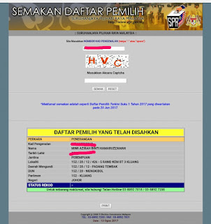 Malam tadi Mimi buat semakan daftar pemilih SPR, tempat mengundi Mimi di Padang Tembak nanti. Sebelum ni Mimi mengundi di 5 RAMD Kem Kluang. Bila suami dah bertukar di Sg Besi, jadi kenalah tukar Pusat Daftar Pemilih kan. Jenuh pula nak pergi jauh jauh. Sebelum ni memang Mimi dan suami mengundi di Kluang. Tapi suami bagi cadangan tukar tempat mengundi. At least, dekat sikit dan mudahkan pergerakan kitorang nak pergi mengundi.