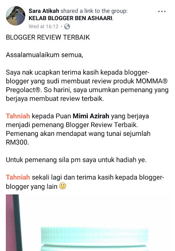 Rezeki Menang RM300 Dari Momma Pregolact | Benarlah apa yang selalu kita sebutkan, rezeki tidak pernah salah alamat. Jika sudah tertulus rezeki kita, pasti akan jadi milik kita. Betul tak? Sebenarnya Mimi dah lama buat entry mengenai Momma Pregolact ni. Dah tak ingat bila publish. Tapi bila tiba tiba blogger Mama Jue share dekat whatsapp, rasa macam tak percaya pun ada. Yelah, lama kot buat entry tuh. Memang dah lupa dah. Alhamdulillah rezeki menang RM300 dari Momma Pregolact.