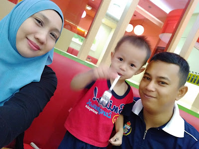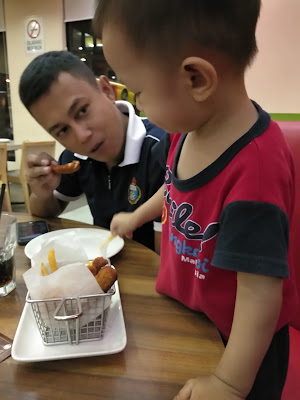 Fries dan chicken fingers Adhwa share dengan Abi dia. Di sua makan pizza pun dia tak nak. Mimi tengokkan Adhwa ni sama macam Abi dia. Kalau sua cheese kan dia tak nak makan. Tangy Chickrn Suami makan seketul saja yang lain dia bagi Aina makan. Dia cakap lain macam betul rasa Tangy Chicken a.k.a Ayam Madu Pizza Hut ni. Bila makan, Mimi rasa okey je sedap apa. Yang sebenarnya tekak dia something wrong kan. Hahaha...Terus teranglah tekak suami Mimi memang tekak Melayu sangat. Kalau makan Western Food pun dia makan KFC jelah. Tu aje yang dia makan. Yang lain nannnn hadooo!!!