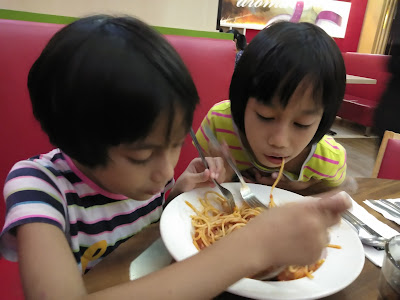 Aina dan Auni Mimi order Spaghetti Bolognaise Chicken satu share dua orang. Mimi tak belikan seorang satu sebab memang takkan habis. Dan naluri seorang Ummi tu takkan salah. Memang betul tak habis pun. Ummi dia juga yang tukang habiskan. Macam mana badan nak kurus macam ni.