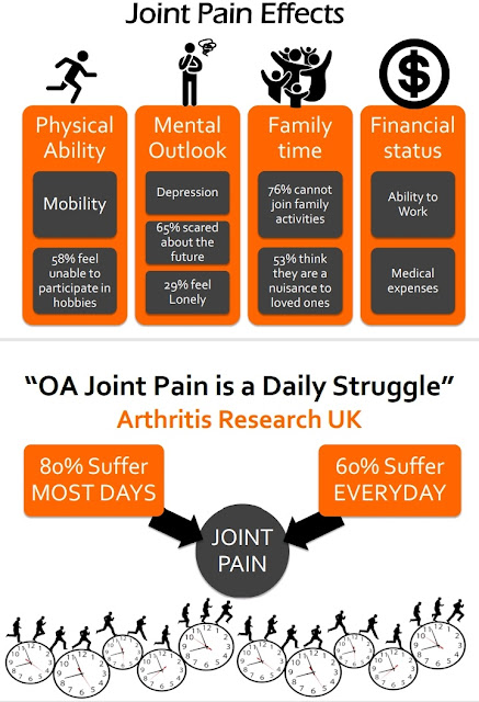 Sendi anda semakin merosot sementara atiritis berkembang, maka semuanya telah berubah. Setiap hari berakhir dengan kesakitan yang tidak dapat ditanggung pada lutut manakala setiap pagi pula bermula dengan cubaan untuk memanaskan lutut anda yang kejang. Ia bukanlah sejenis kesakitan seperti patah tulang yang akhirnya menjadi lebih baik, tetapi ia merupakan kesakitan dan kekejangan pada sendi yang sentiasa ada. Kebanyakan orang mengalami kesakitan sendi di lutut mereka di mana risiko mengalami osteoarthritis lutut seumur hidup kini dianggarkan sekitar 45%. Ada juga yang mengalami sakit sendi di jari, bahu dan belakang.