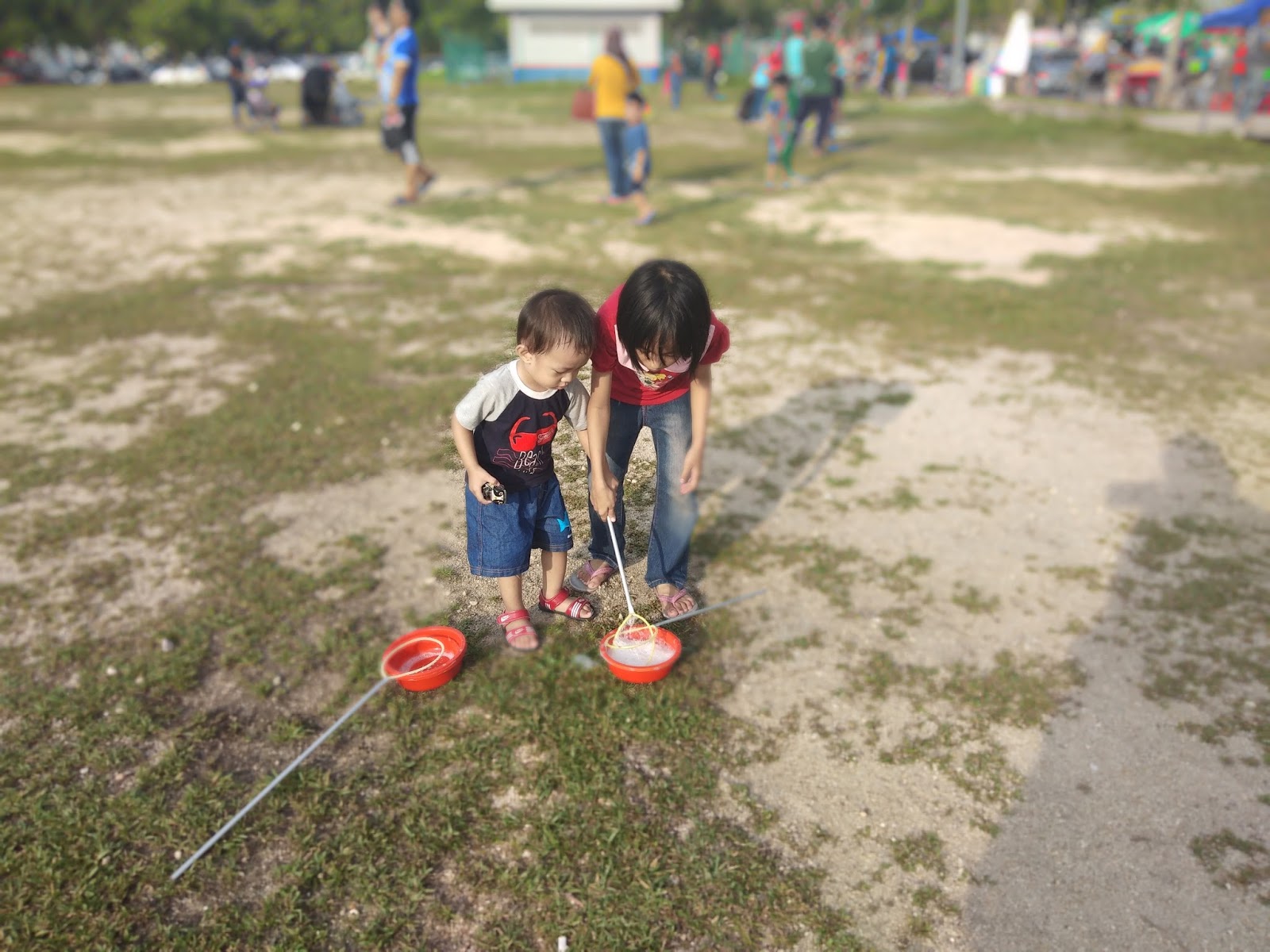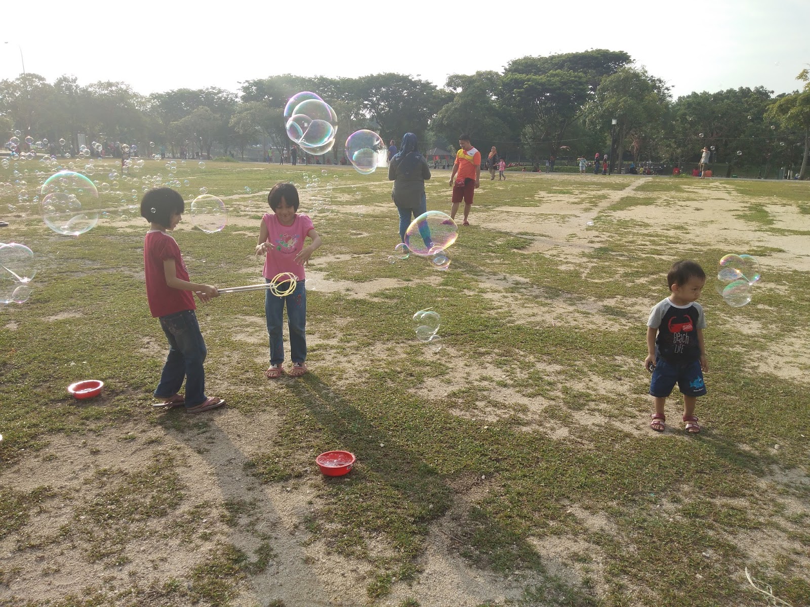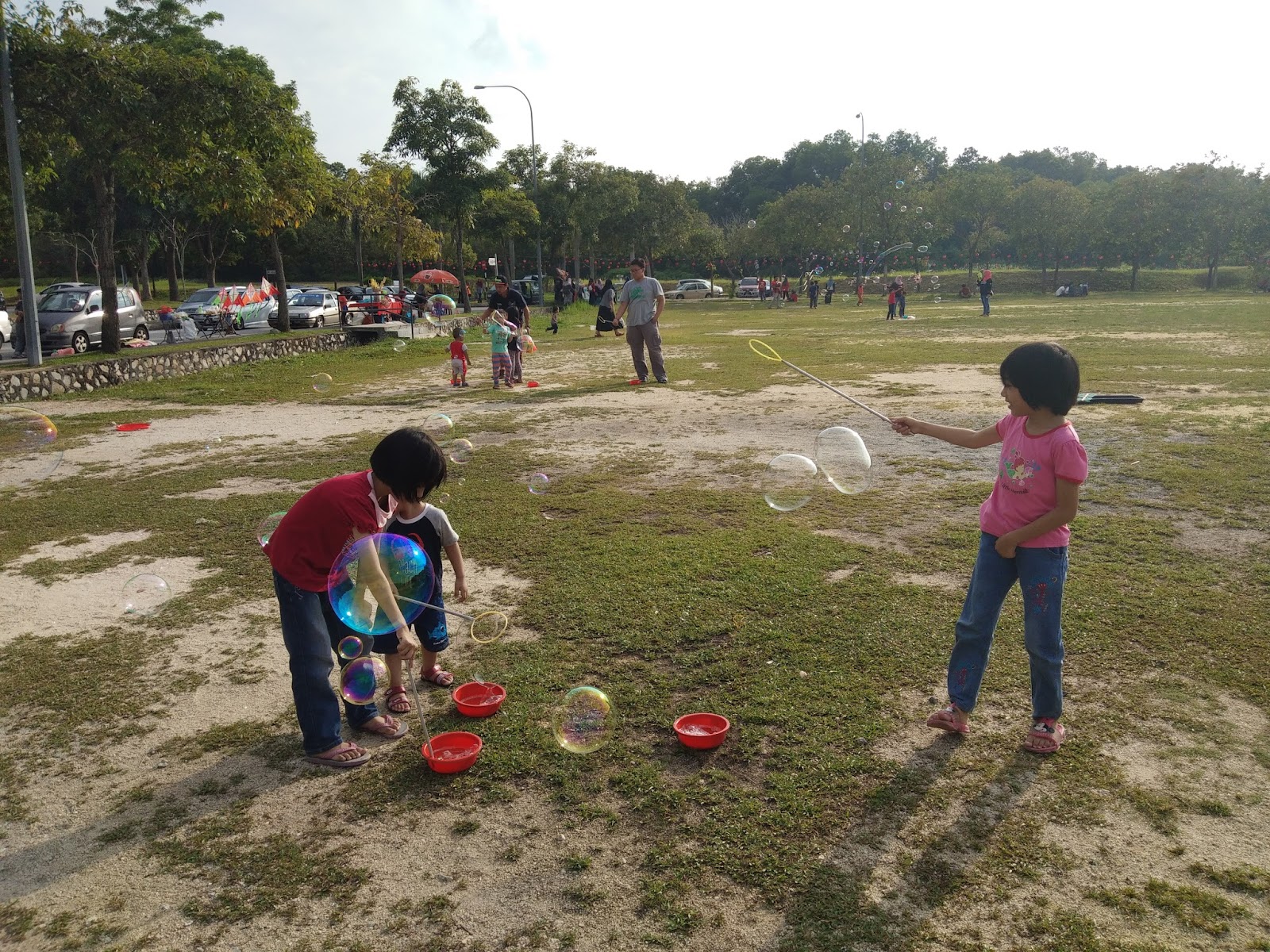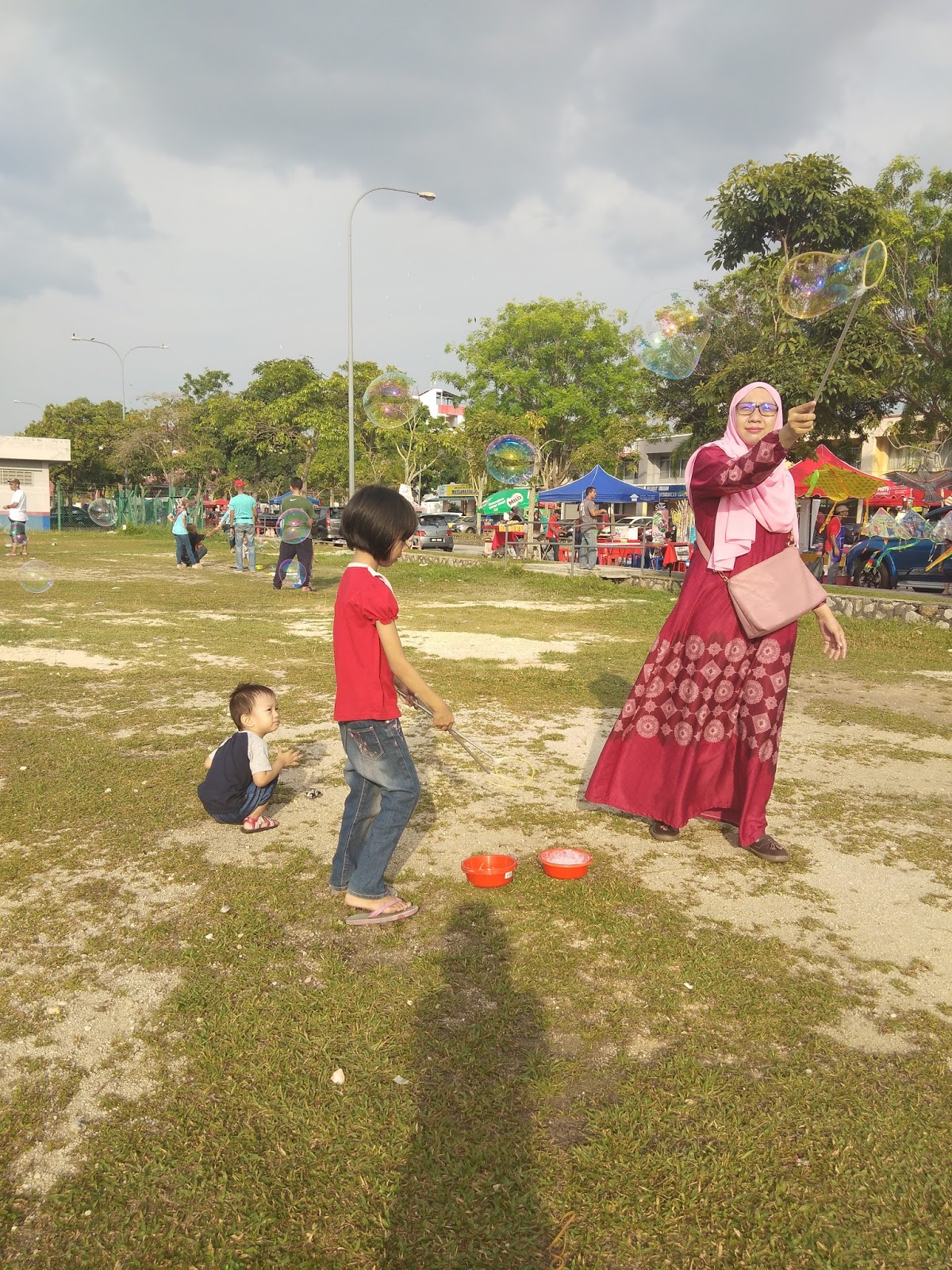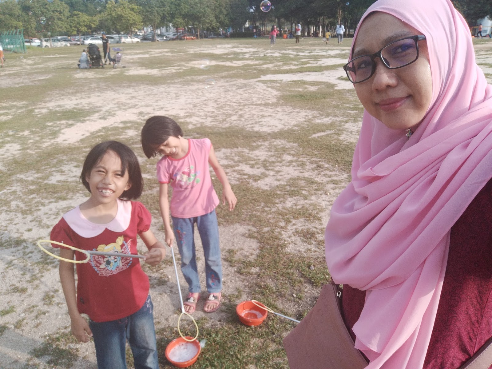 Sampai saja terus Mimi sewa beli tiga mangkuk berisi air sabun dan tiga batang yang hasilkan belon tu. Tak tahu pula namanya. Bila tengok anak anak seronok main belon, Mimi pun tumpang sekaki. Nampak diorang seronok bila keluar dari rumah. Yela kat rumah pun, Mimi bagi main di kawasan porch kereta saja. Kawasan di luar dari pagar tak dibenarkan.