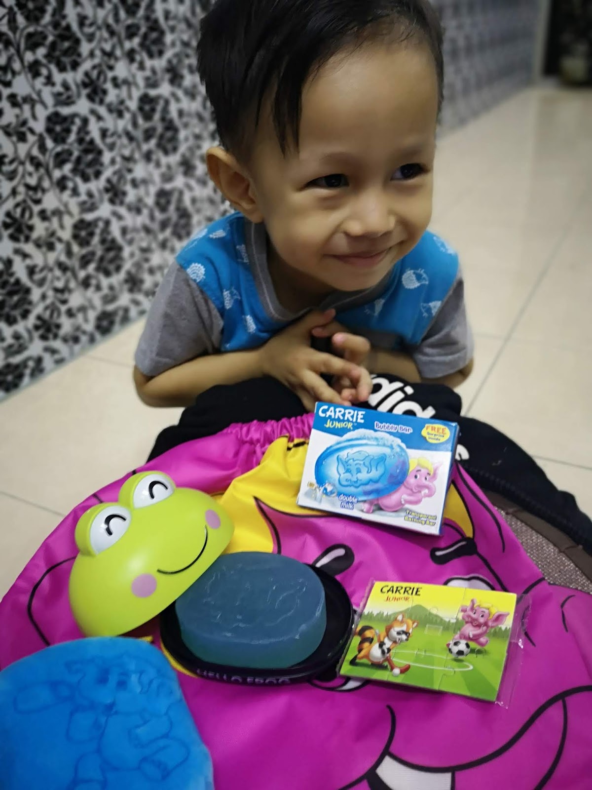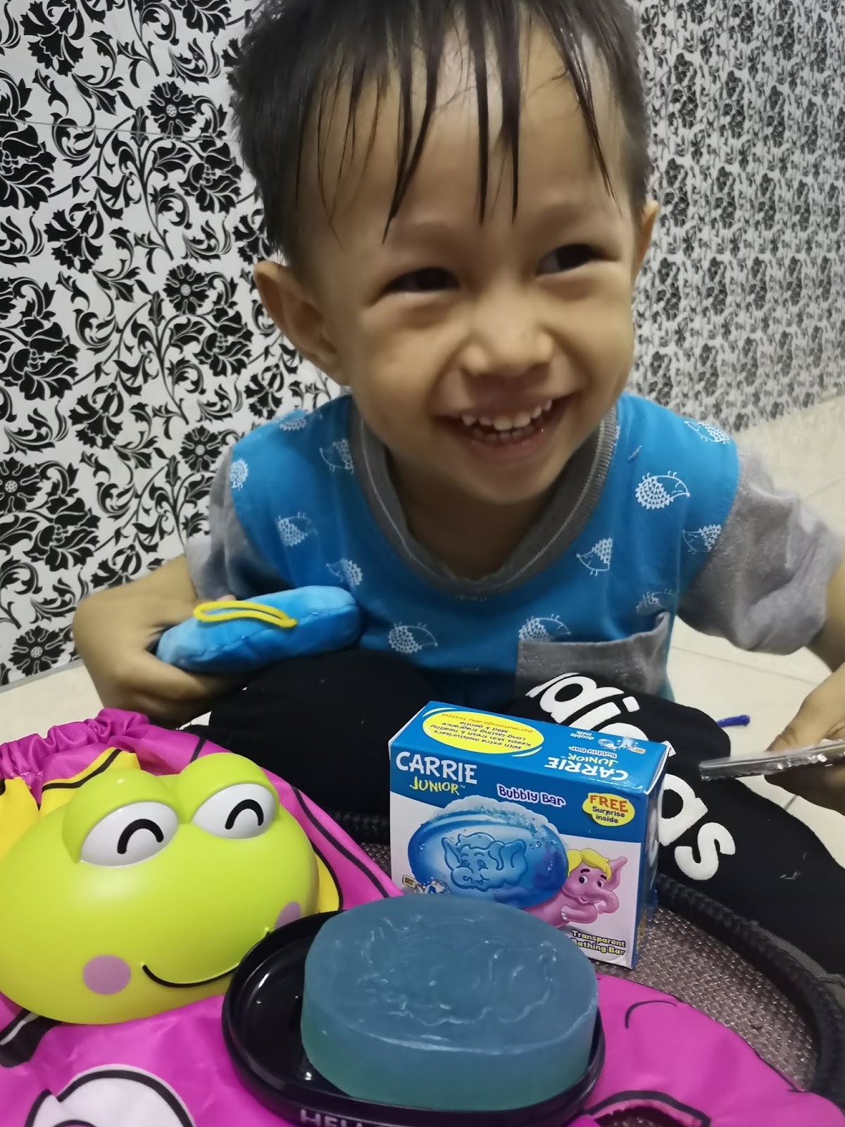 Sukanya dia dapat mandi dengan Carrie Junior bar hehehehe dulu zaman sekolah kita selalu guna sabun macam ni tapi sekarang guna yang liquid jer wakakak rindu mesti wangi dan banyak buih bestnya mandiii...