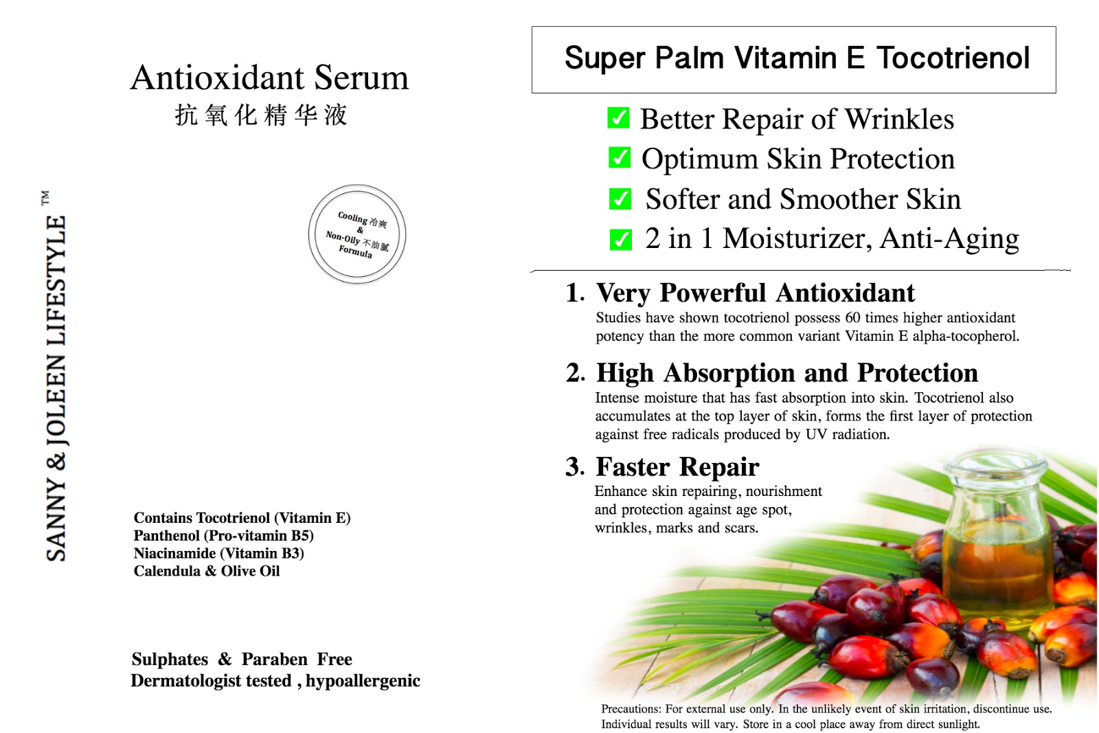 Keunikan yang difokuskan di dalam Antioxidant Serum ini ialah Tocotrienol Vitamin E di mana kajian menunjukkan Tocotrienol mempunyai potensi antioksida 40 hingga 60 kali lebih tinggi daripada yang lebih biasa iaitu Vitamin E aplhatocopherol. Antara kelebihan lain Vitamin E ialah :