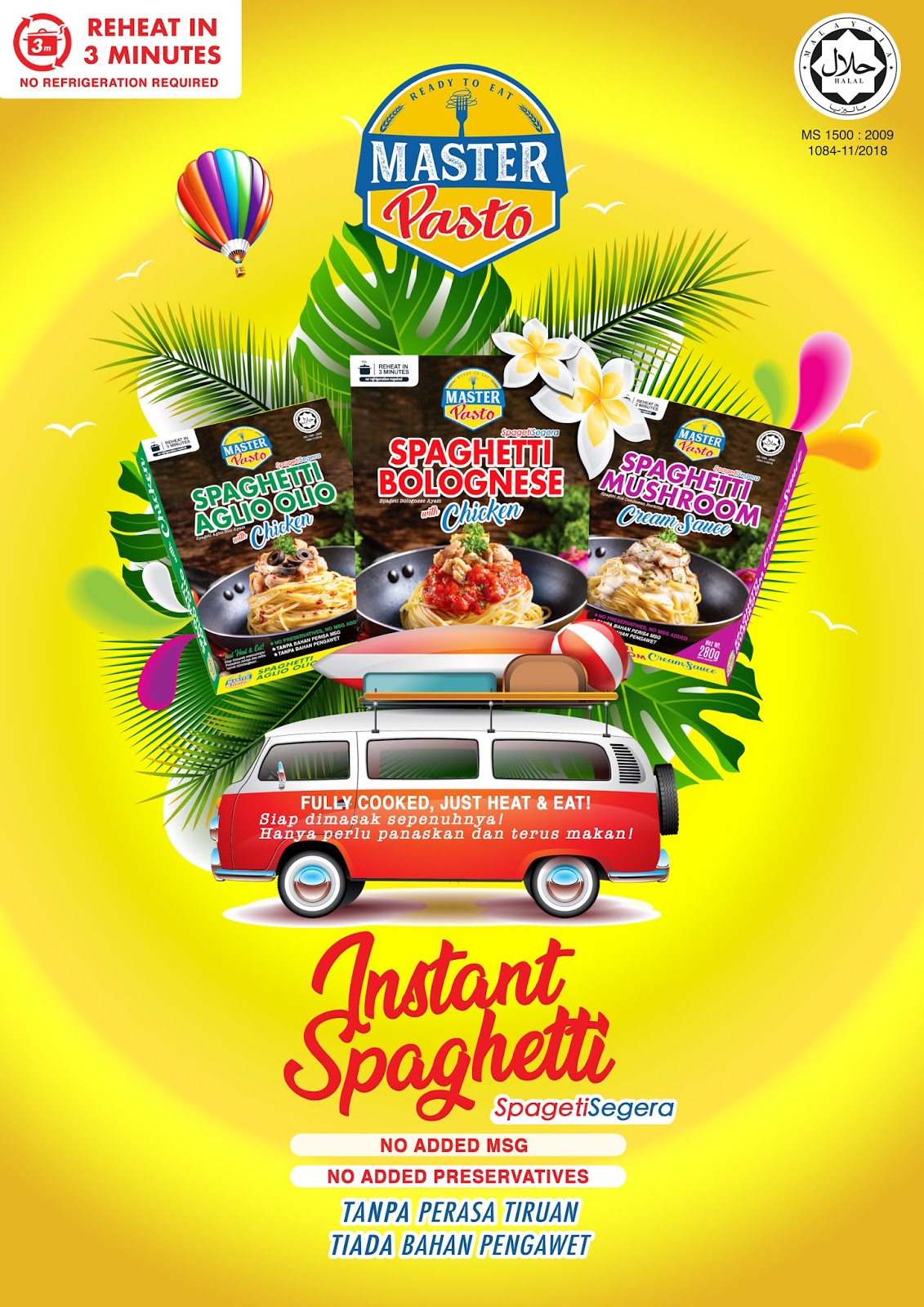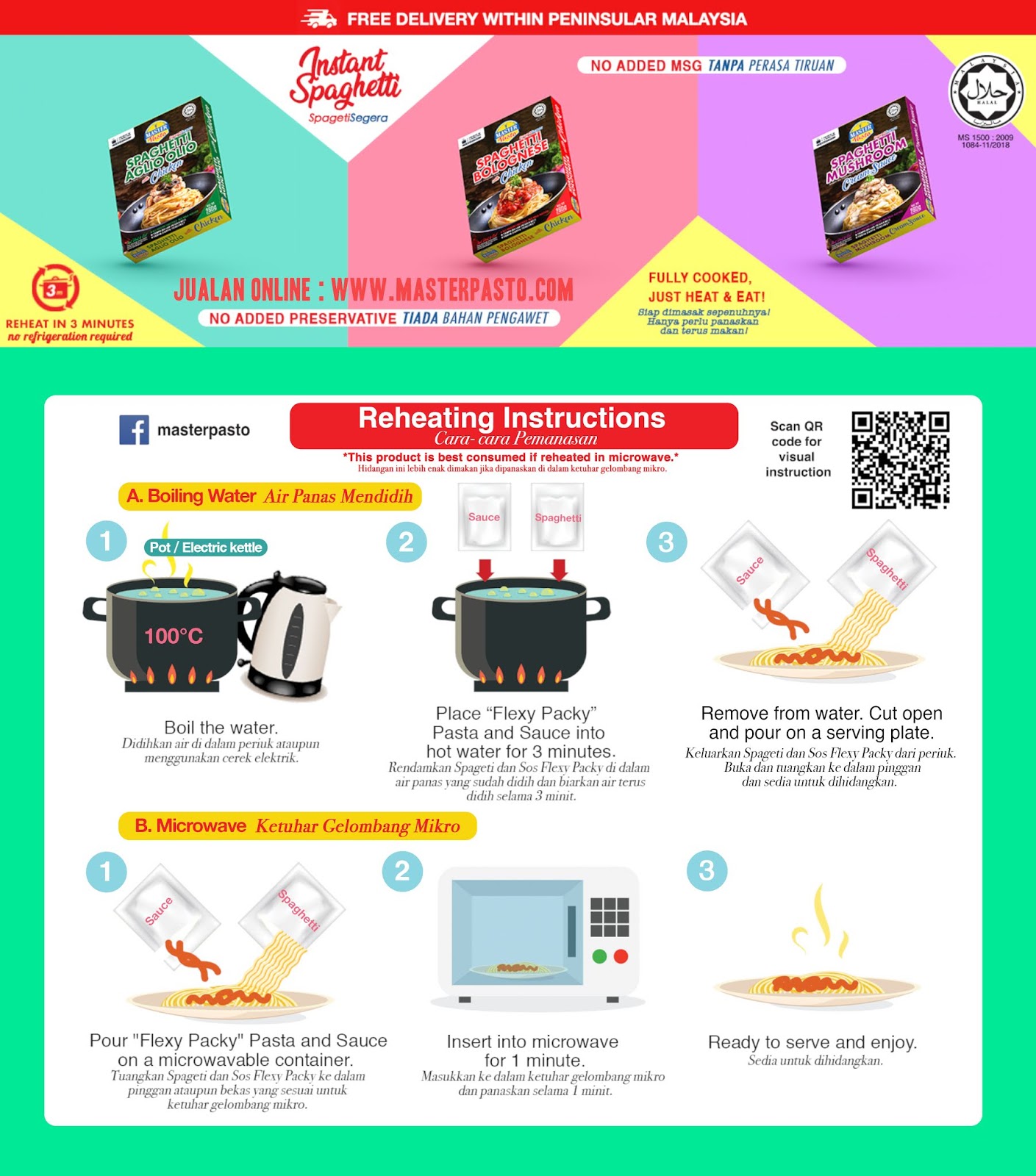 Master Pasto Spaghetti Segera 3 minit ready-to-eat dan produk yang selamat dimakan kerana mengandungi bahan semulajadi di mana ia tiada MSG, tiada bahan pengawet dan tidak perlu simpan dalam peti sejuk. Nak sediakan semudah abc saja tau korang . Panaskan lebih kurang 3 minit. Dah siap boleh hidang dan makan.