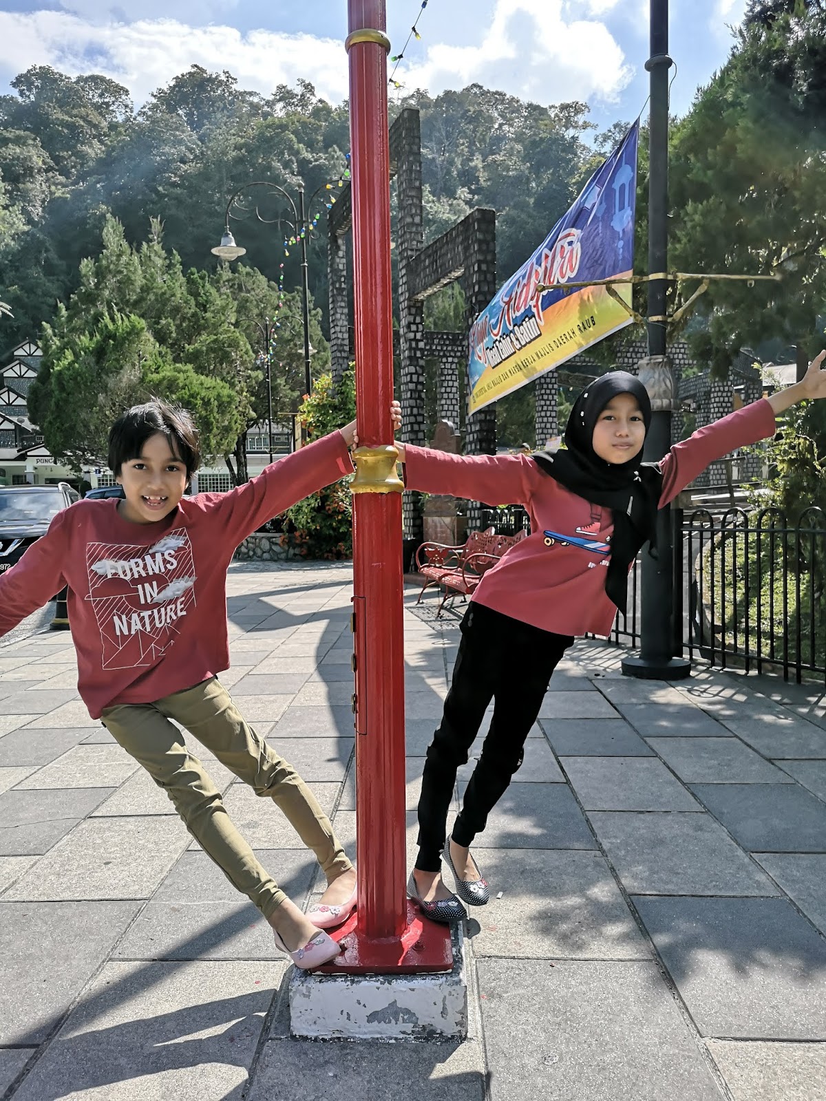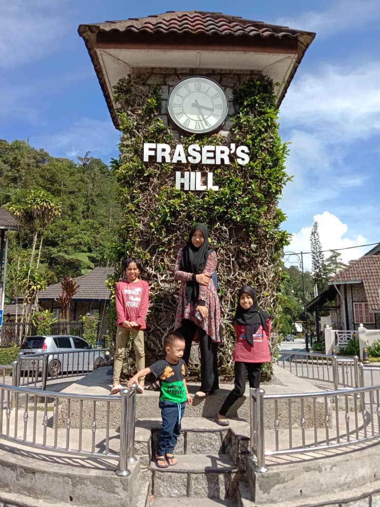 Lepas settle misi membersihkan muntah Auni, kitorang sambung lagi perjalanan. Dah nak dekat pun sampai dekat Menara Jam Bukit Fraser tu. Sampai je terus parking, suami pergi makan di Restoran Strawberi Mimi. Mimi bawa anak anak pergi tandas awam.