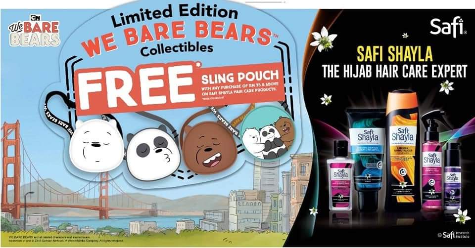 Hah senangkan?? Jadi apa tunggu lagi, apa kata korang dapatkan rangkaian produk SAFI SHAYLA ANTI KELEMUMUR ni sekarang sebab apa tau! Sebab sekarang ni SAFI SHAYLA mengadakan promosi dengan setiap pembelian produk PENJAGAAN RAMBUT SAFI SHAYLA berharga RM35 dan ke atas, korang berpeluang memiliki sling bag WE BARE BEARS limited edition dan comel ni.