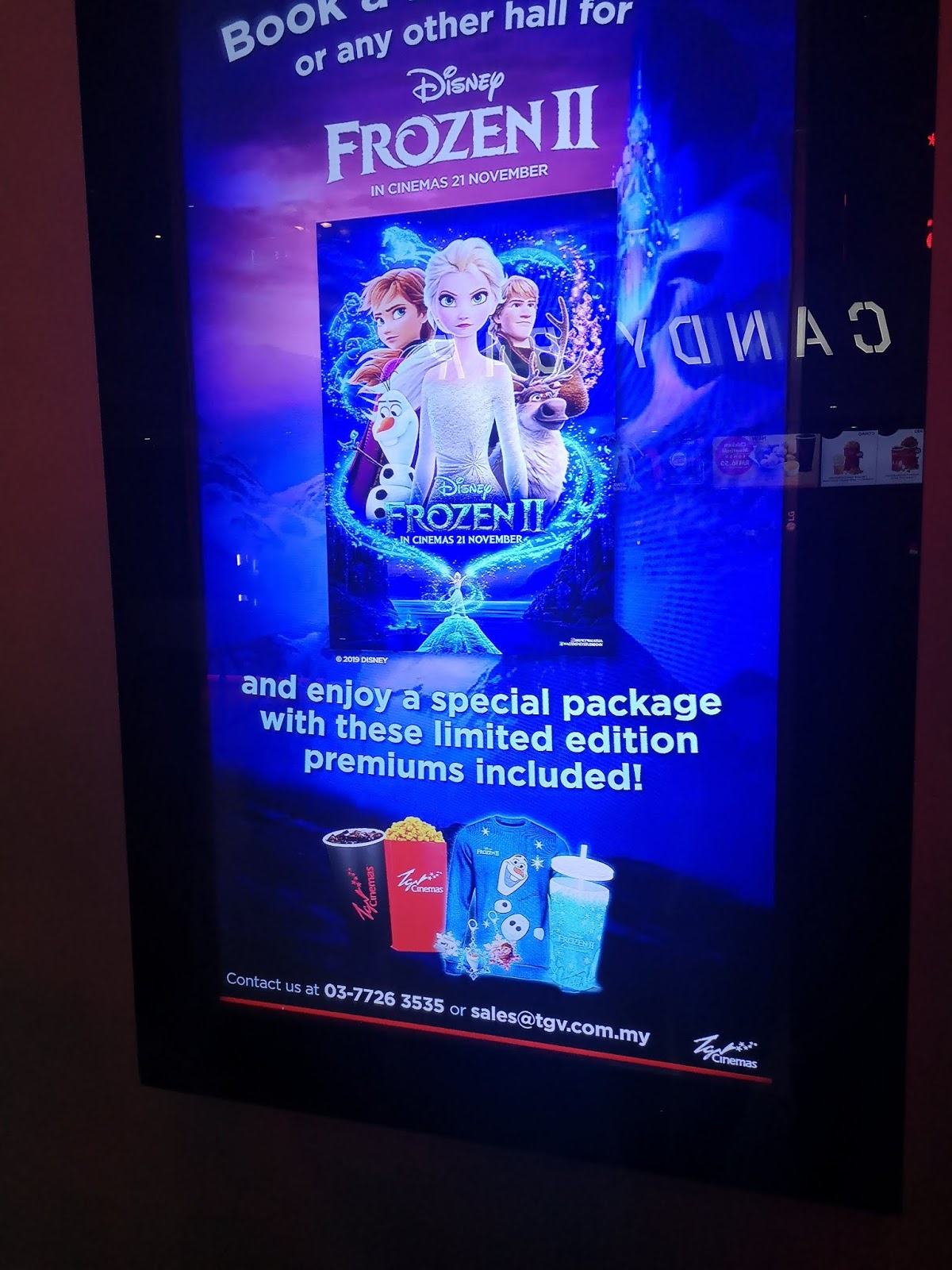 Mimi tengok wayang di TGV Aeon S2 je. Kira paling dekat dengan rumah. Nak pergi Palm Mall bercinta sikit. Tapi sayanglah di TGV tak ada pun prop Frozen 2. Kalau ada memang dah bergambar sakan.