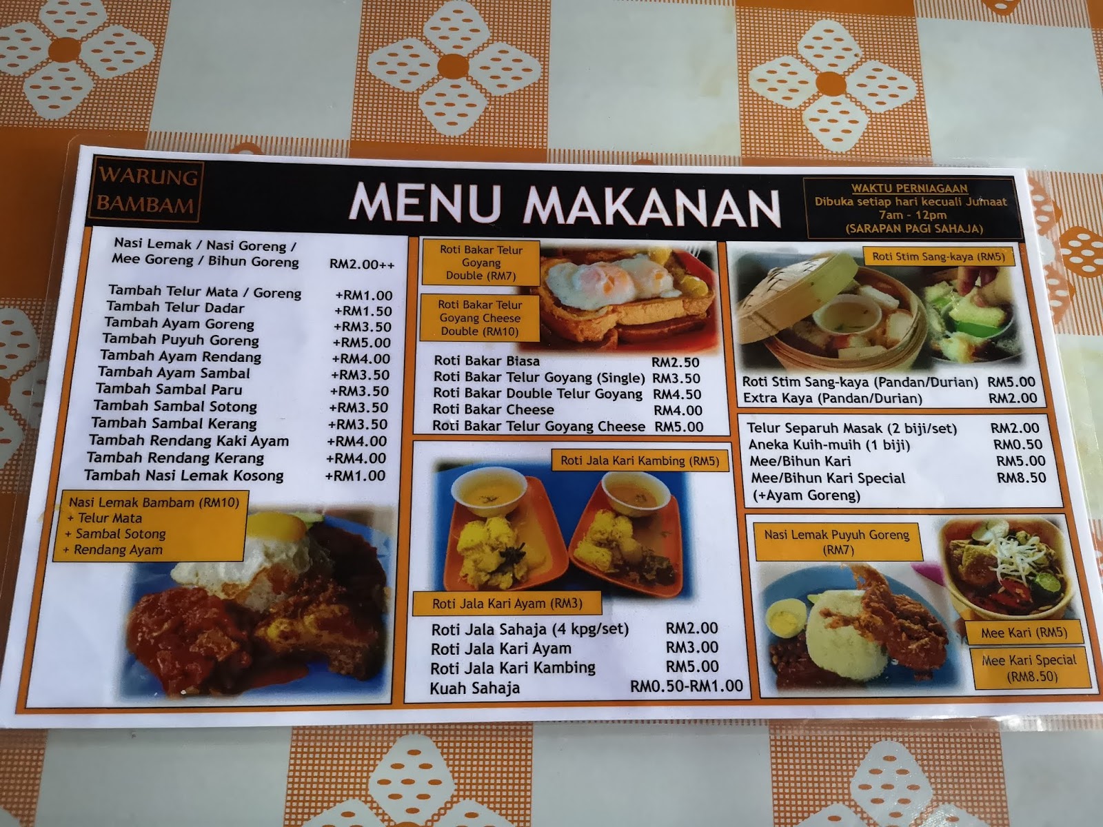 warung bambamAda sarapan biasa, iaitu nasi lemak, kuih muih, dan roti canai. Tapi yang special adalah Roti Bakar Telur Goyang. tak lupa ada roti jala dan roti stim. Roti stim ni sangat enak. tak tipu.