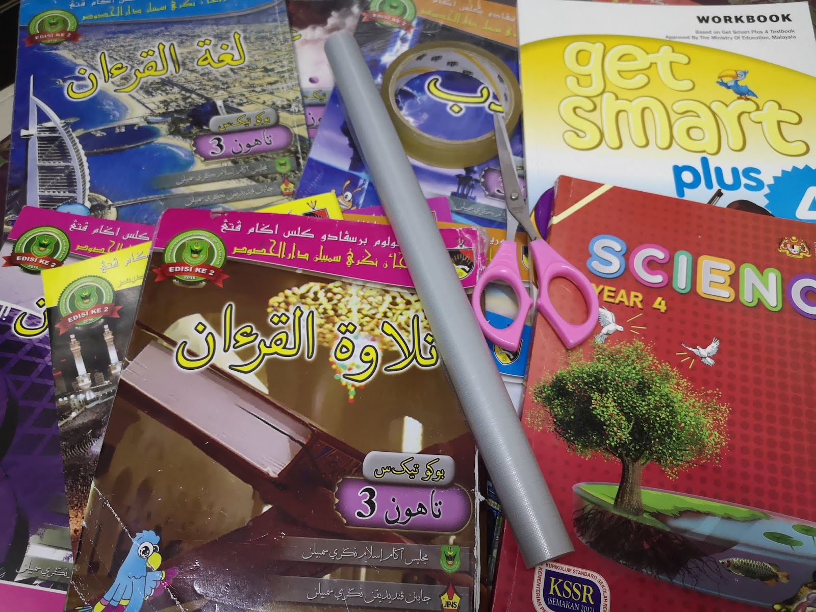 Alhamdulillah walaupun 3 buah buku saja kena balut sebab yang lain masih cantik berbalut rasa lega selesai juga. Walaupun ambil masa..Macam tuhlah kan kalau dah jadi mak mak ni. Memang tak lari dari buat semua ni bila awal persekolahan bermula.