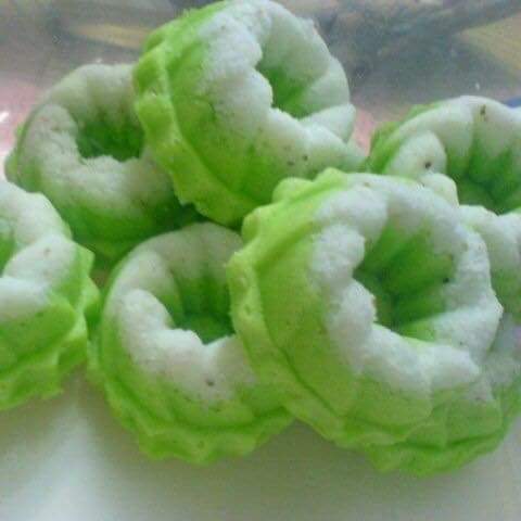 Sudukan warna merah dalam acuan 1/2 acuan. Kukus dalam 3-4 minit bila adunan mula mengeras. Perlahan lahan sudikan warna putih, sedikit sahaja. Kukus lagi dalam 3 minit. Kemudian warna hijau juga sedikit. Kukus 10 minit atau hingga masak.