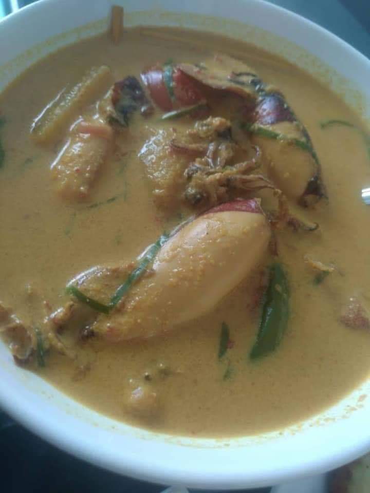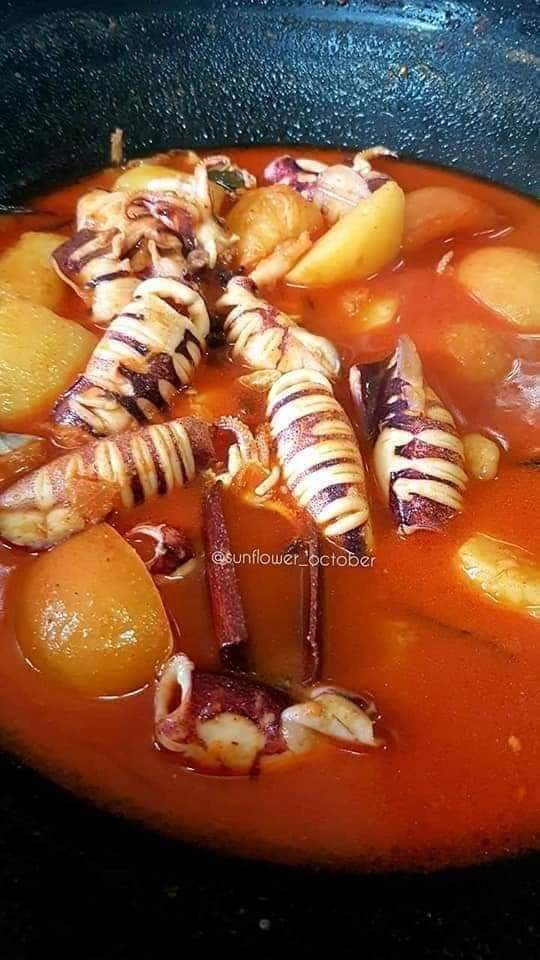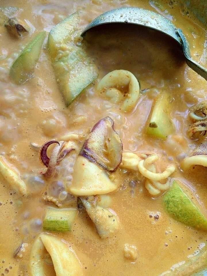 5. Biarkan kuah mendidih dan masukkan sotong. Sekali sekala kacau kuah supaya santan tak pecah minyak.