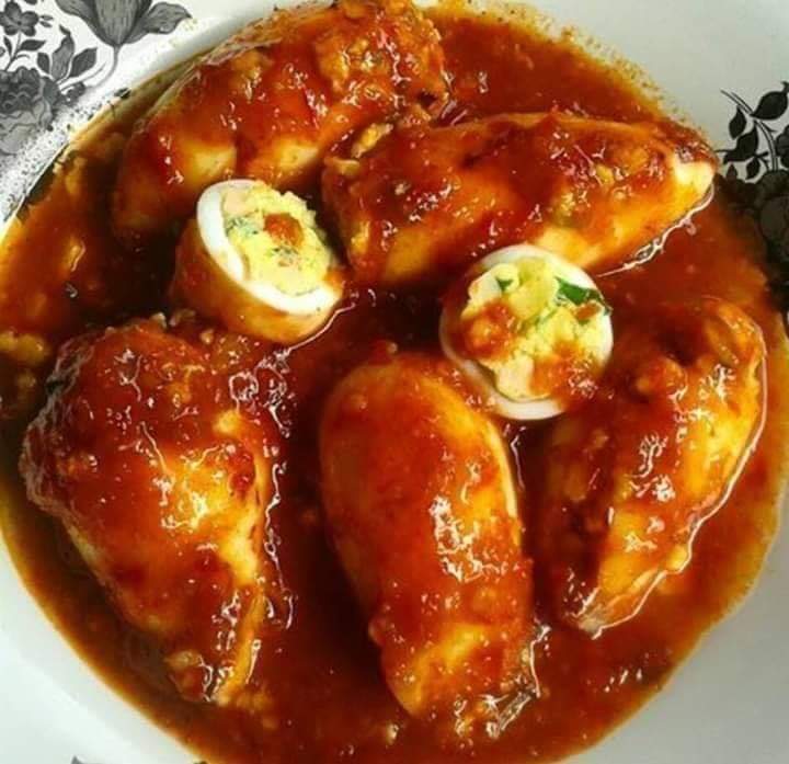 4. Ambil kepala sotong dan masukkan ke dalam badannya yang berisi beras pulut tadi.