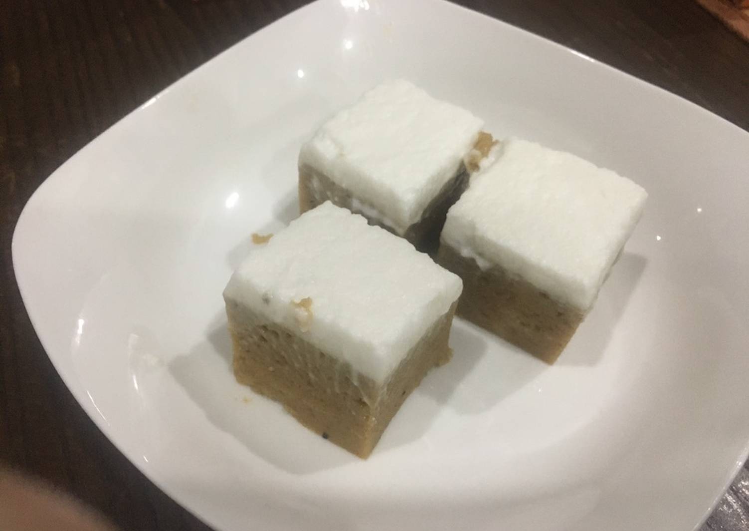 Satukan semua bahan bahagian atas. Tapiskan pada bahagian bawah tadi. Kukus 20 minit dengan api perlahan(bukan paling perlahan ya)