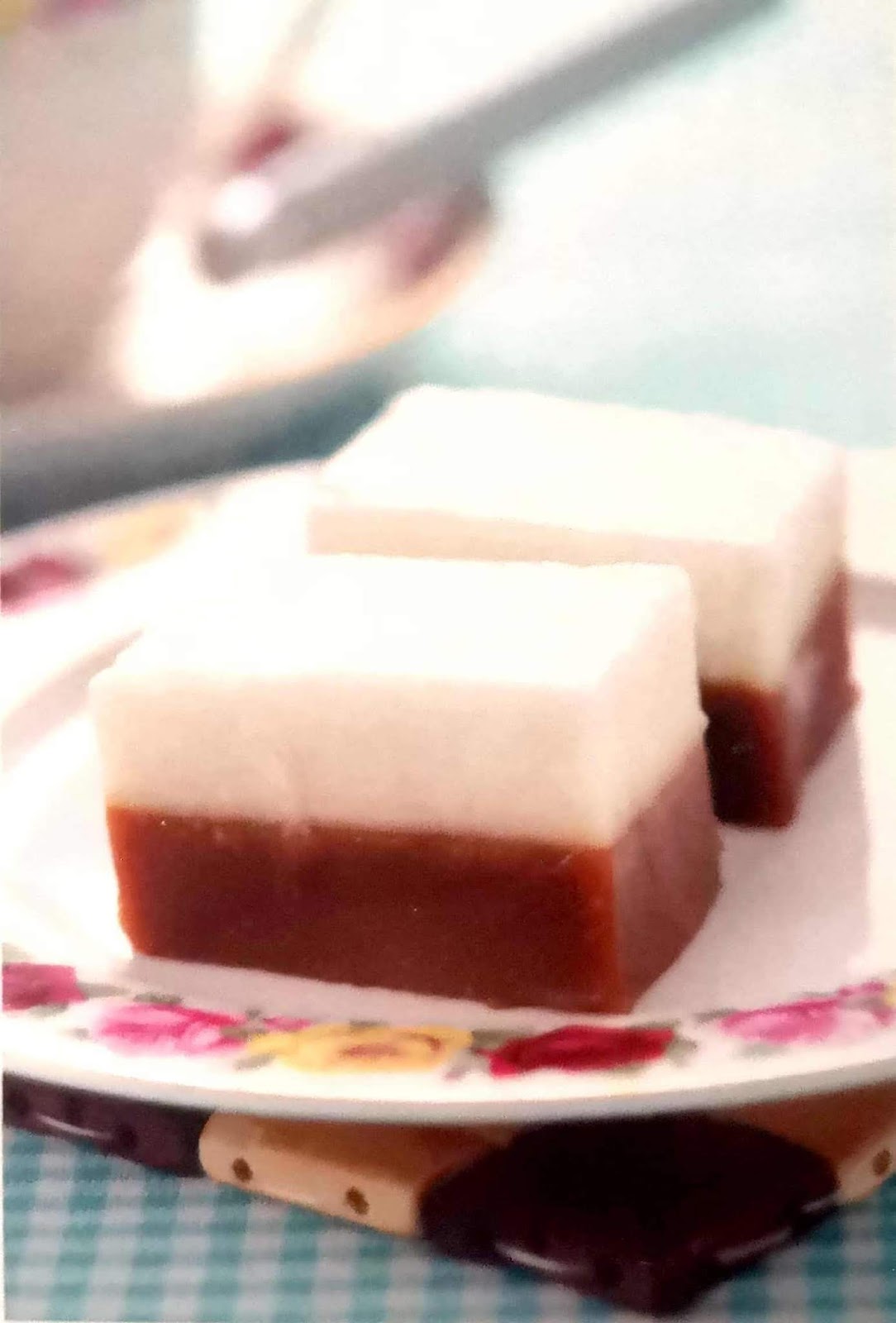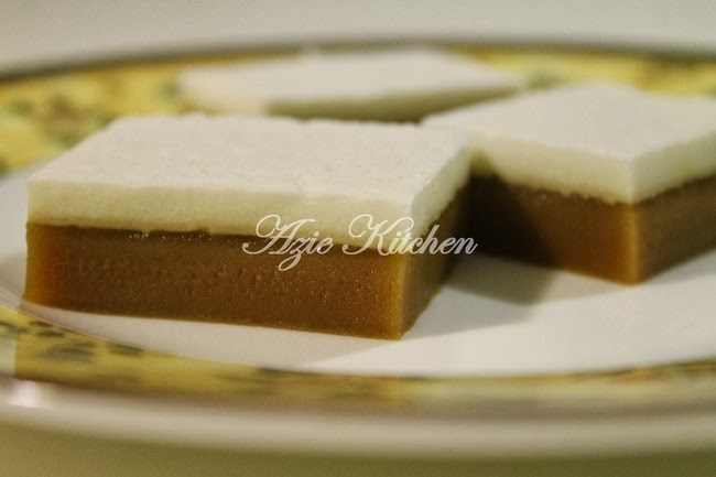 Satukan kesemua bahan lapisan atas sehingga sebati dan tapiskan. Kemudian tuang perlahan lahan ke atas bahan  bawah supaya tidak berbuih. Kukus selama 15 minit lagi.