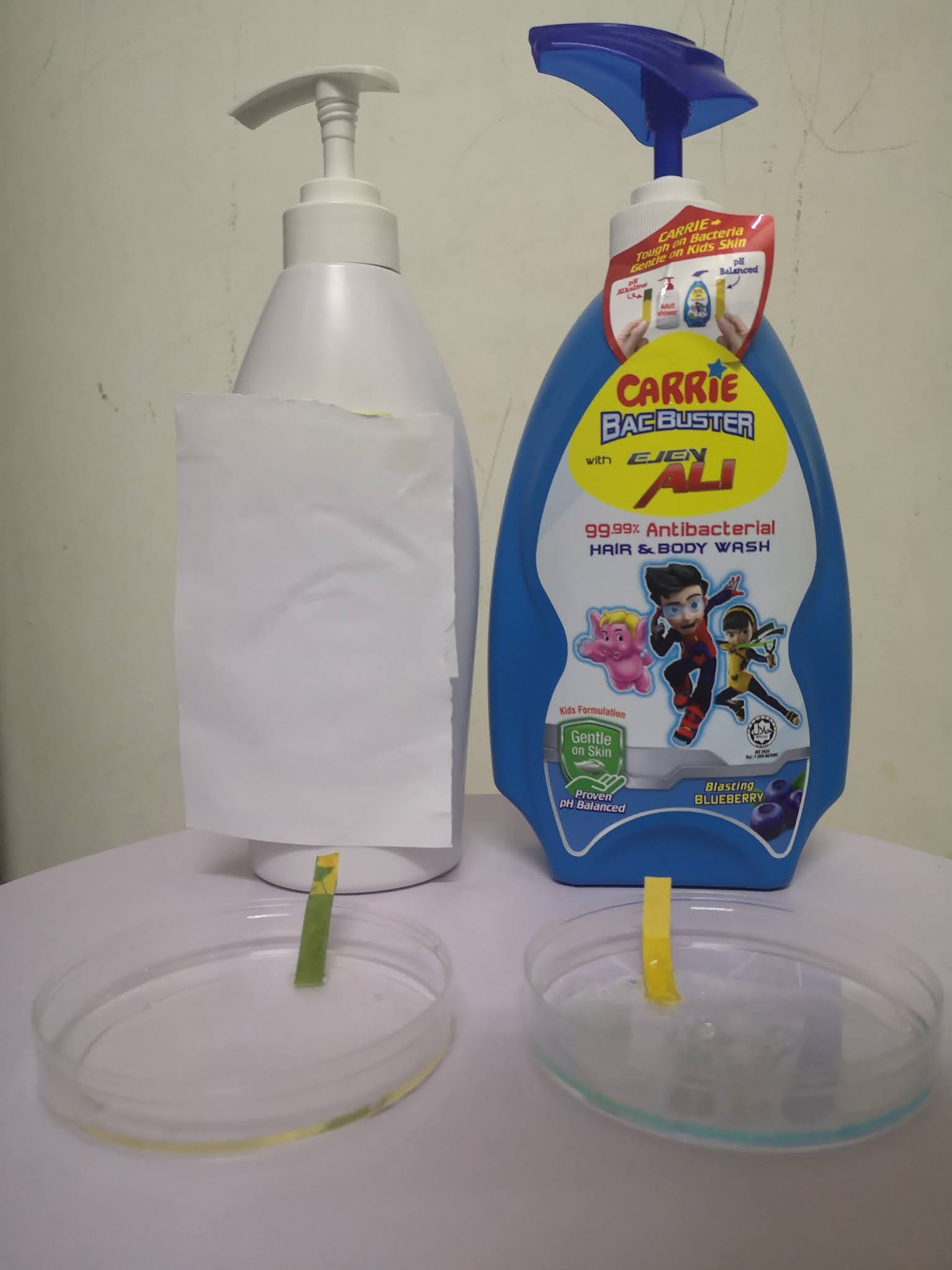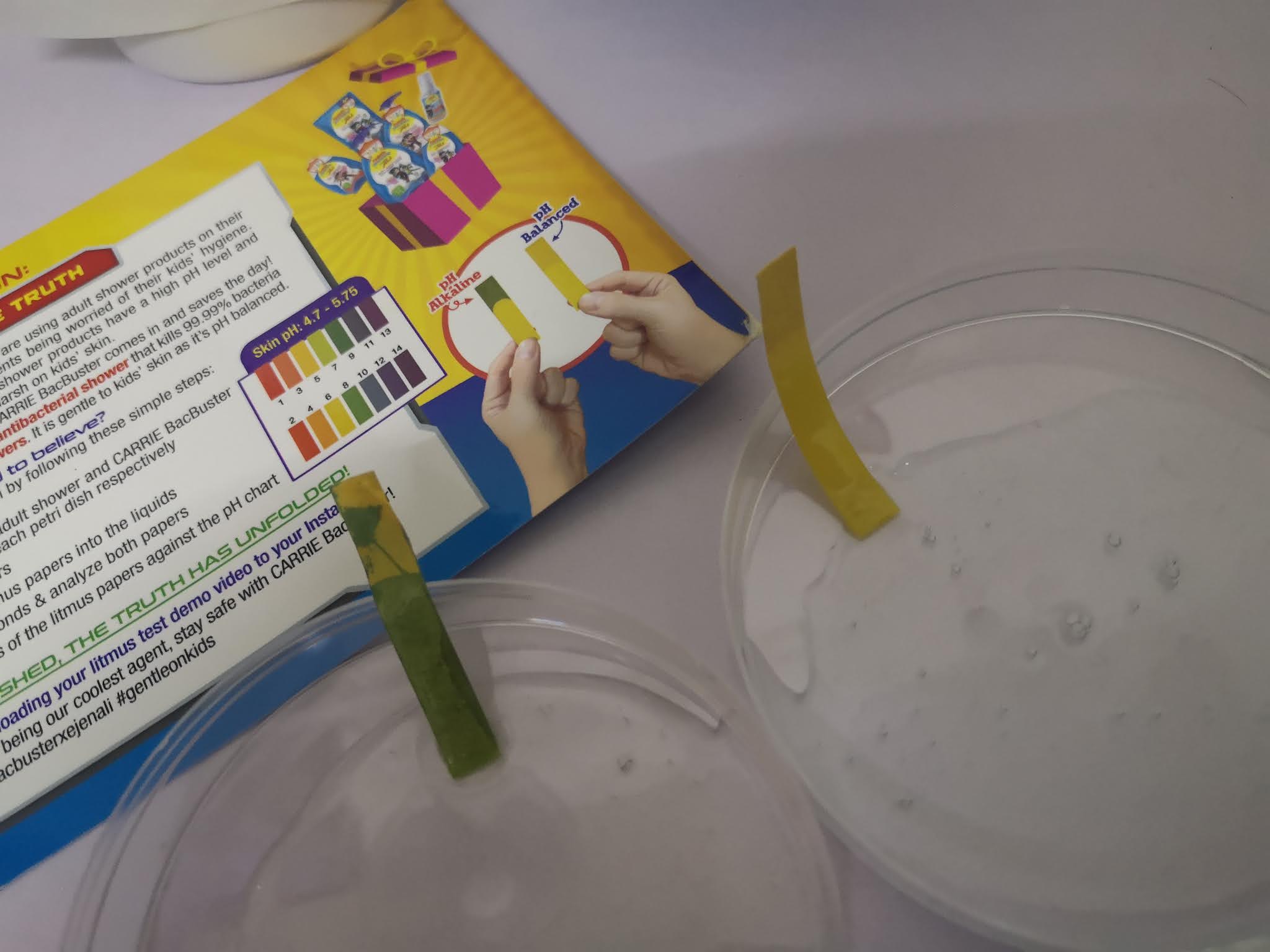 Kertas litmus yang direndam dalam cecair mandian Carrie Bacbuster tidak bertukar warna manakala kertas litmus yang direndam dengan mandian dewasa telah bertukar warna hijau di mana ia bersifat alkali.
