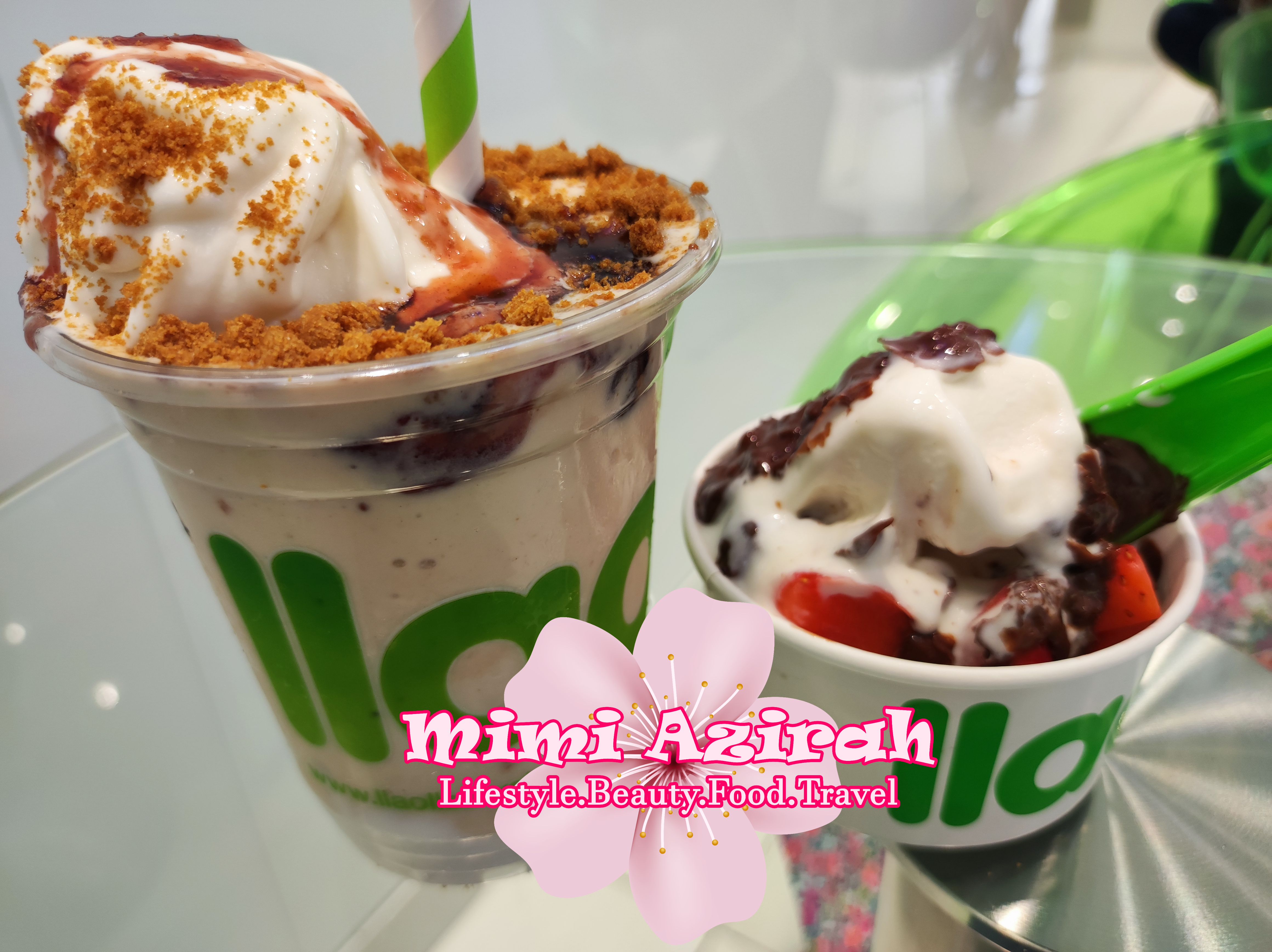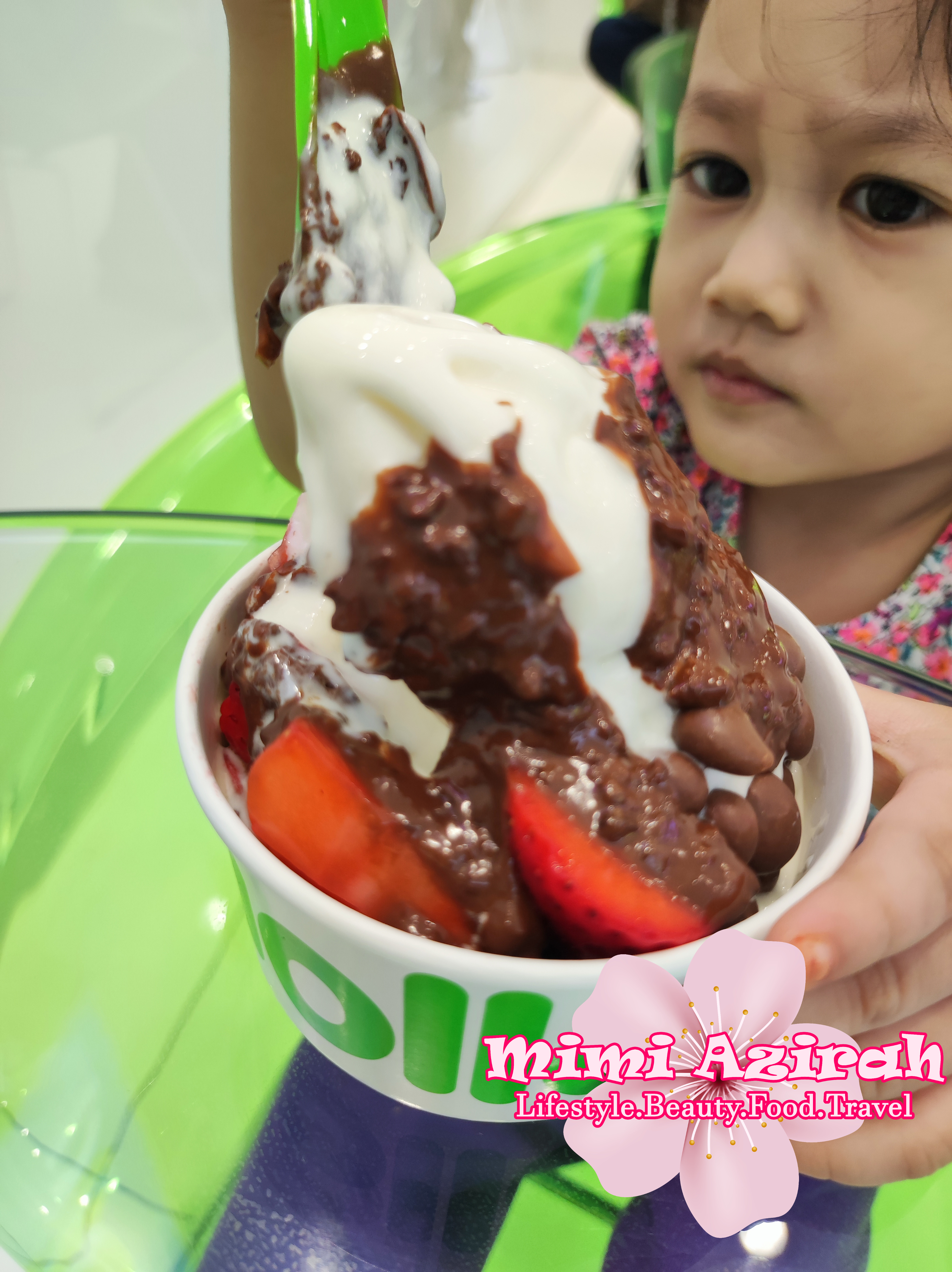 Mimi pilih tubs small topping strawberry, kit kat bited dan ovomaltine sauce untuk Amani. Untuk tubs tu setiap topping tambahan kena caj RM2.50. Mimi pilih topping ikut apa yang Amani tunjuk. Mimi pula pilih Smoothie with Yogurt Cheesecake.