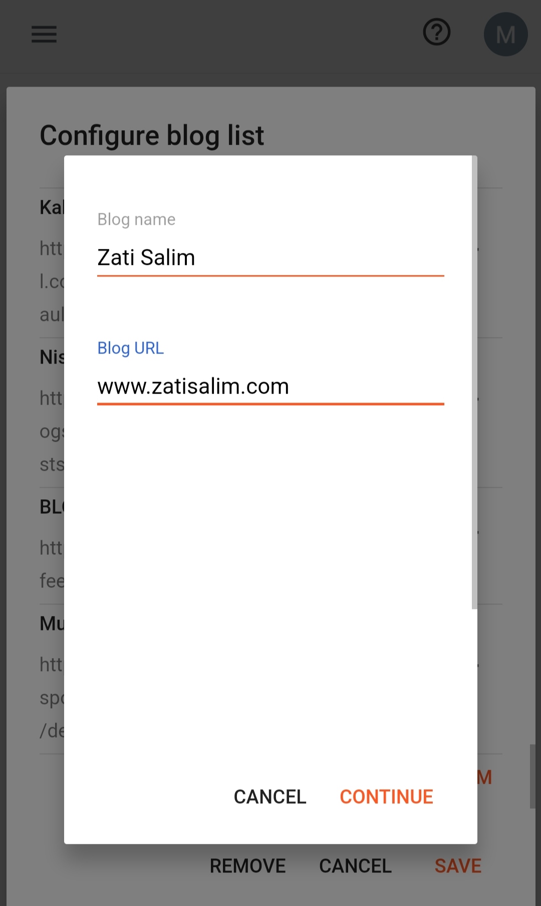 2. Add new item > Blog Name (Masukkan nama blog yang ingin ditambah @ nama blogger) dan Blog URL (masukkan url blog)