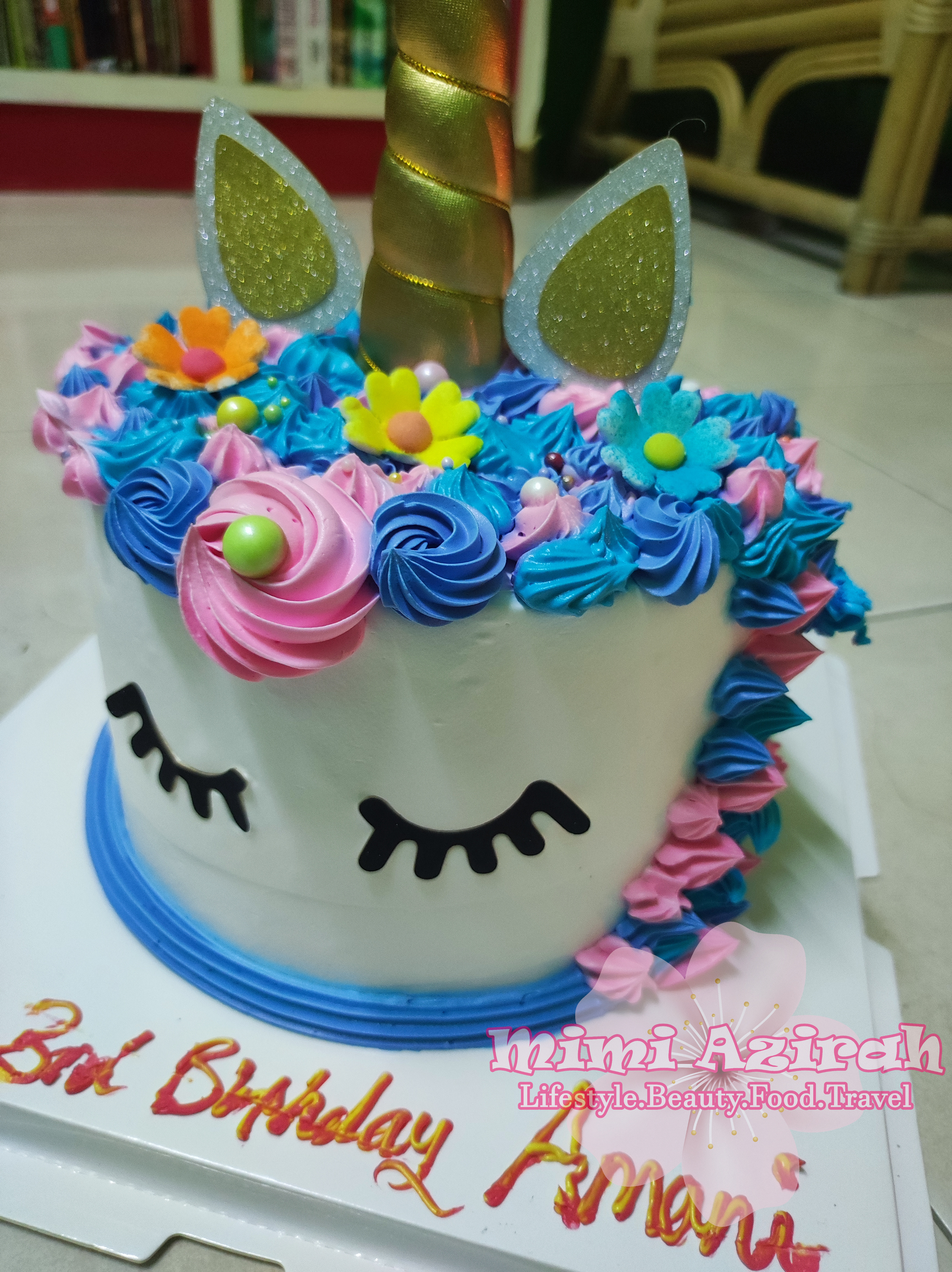 Amani @ Biyani pula sambut hari lahirnya yang ke 3 tahun selepas 5 hari lahir kakak Aina iaitu pada 1hb Februari. Kek Amani Mimi beli tema unicorn. Ambil dia di rumah pengasuh, masuk je kereta dah jerit kek. Bukan main lagi tengok kek tak lepas. Asyik cakap cantik.