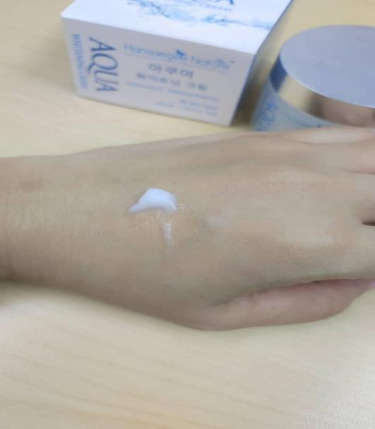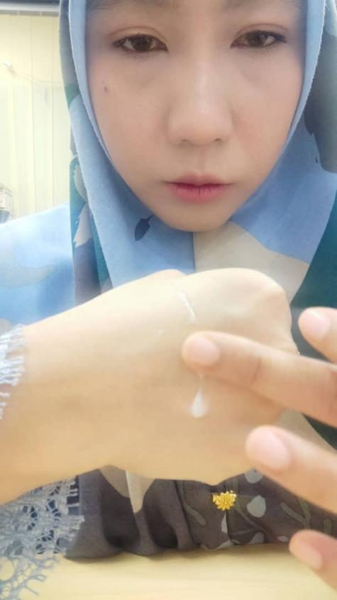 Ada titisan air pada permukaan tangan selepas sapu dengan moisturizer Aqua Whitening Cream